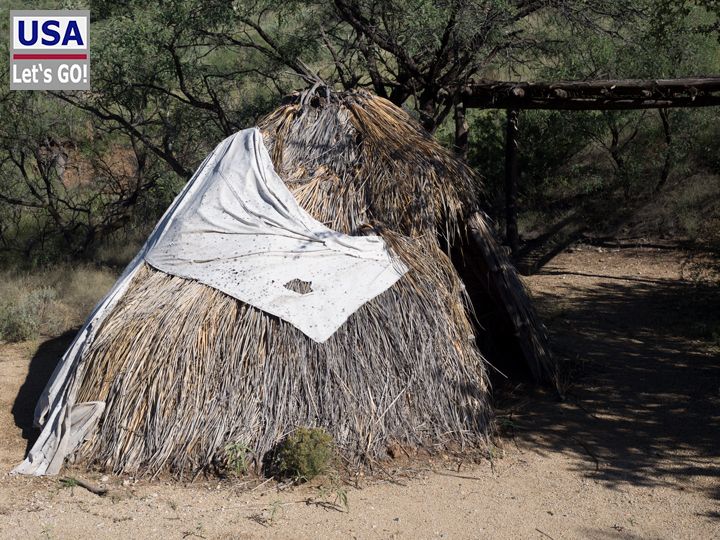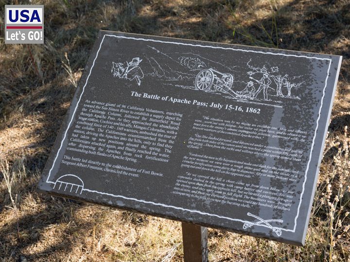(Auf dem linken Bild werden die Geschehnisse rund um die Schlacht am Apachenpass beschrieben. Rechts sieht man eine typische Apachenbehausung, auch wickiup genannt.)