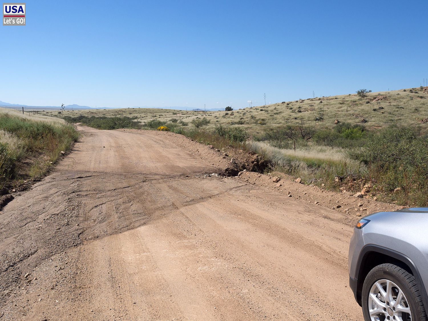 Auf der anderen Seite des Passes läuft die Straße flach zum Arizona Highway 186 aus. Links und rechts befinden sich Weiden, die wohl zu großen Farmen gehören.
