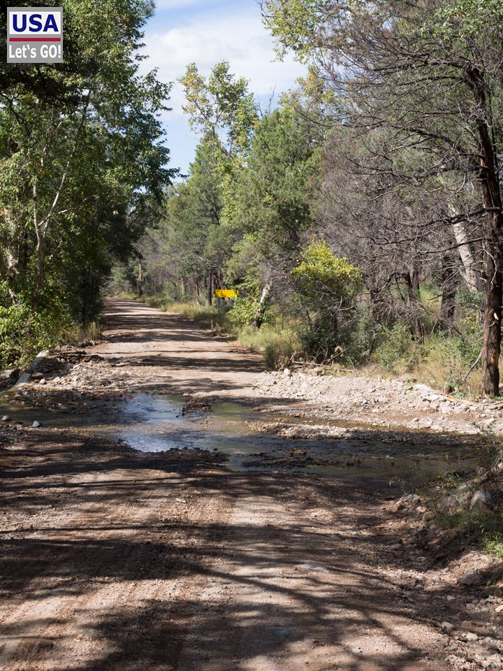 Zunächst geht es sehr reifenfreundlich vorwärts. Die Pinery Canyon Road ist relativ breit, weitgehend ohne ruppigere Passagen und man kann zügig fahren. Ein paar kleinere washes, die angesichts der heftigen Regenfälle der letzten Tage etwas Wasser führen, sind für meinen Cherokee kein Problem.