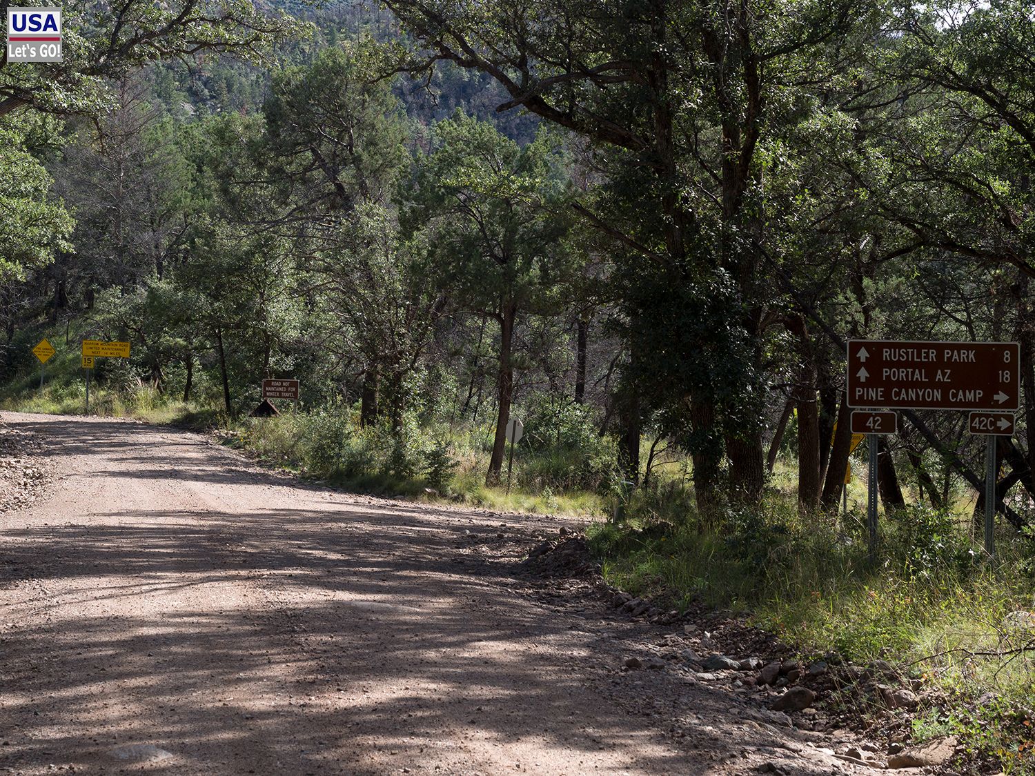 Naja, solange es so flott weitergeht wie bisher, ist das alles kein Problem. Nach ein paar Meilen ändert sich jedoch das Bild schlagartig. Die Straße, die den Warnschildern zufolge nun für größere Fahrzeuge tabu ist (narrow winding mountain road), verengt sich und steigt teilweise relativ stark an. Außerdem ist der Untergrund wesentlich ruppiger. Nach meiner Navi-Karte bin ich nun auf der Forest Service Road #42.