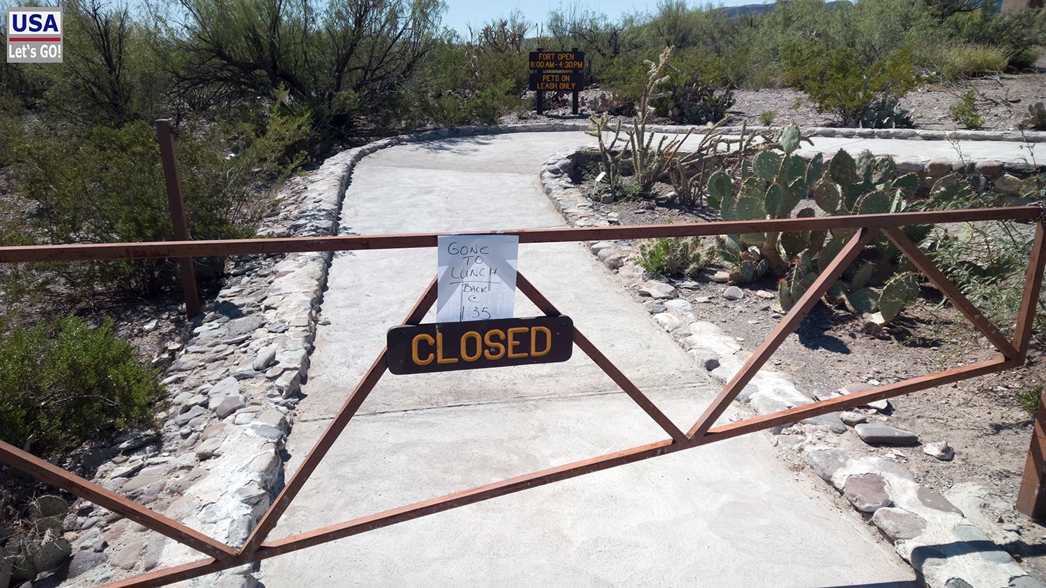 in Presidio nehme ich zunächst eine falsche Abzweigung, die nach Ojinaga (MEX) führt. Schnell einer Dreher gemacht und dann rechts ab auf dem State Highway #170 Richtung Osten. Mein nächstes Ziel ist Fort Leaton, doch leider komme ich dort zur Mittagszeit an und das Fort ist geschlossen: lunch break. Back at 1:35.