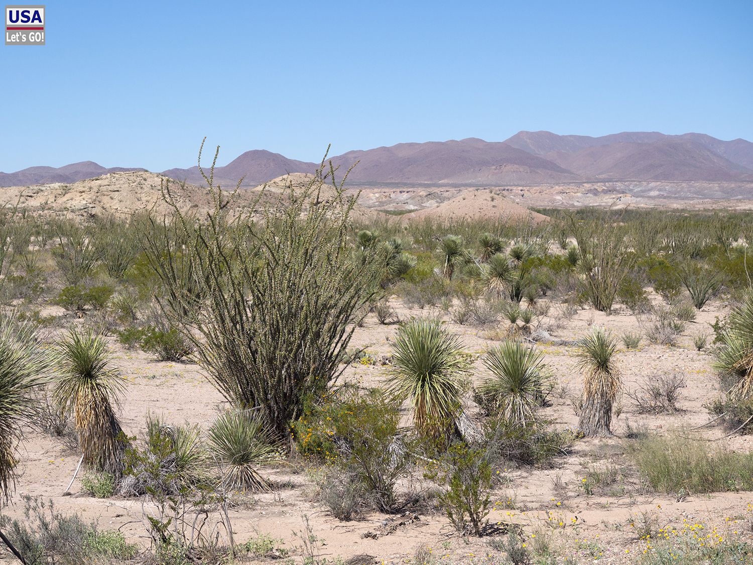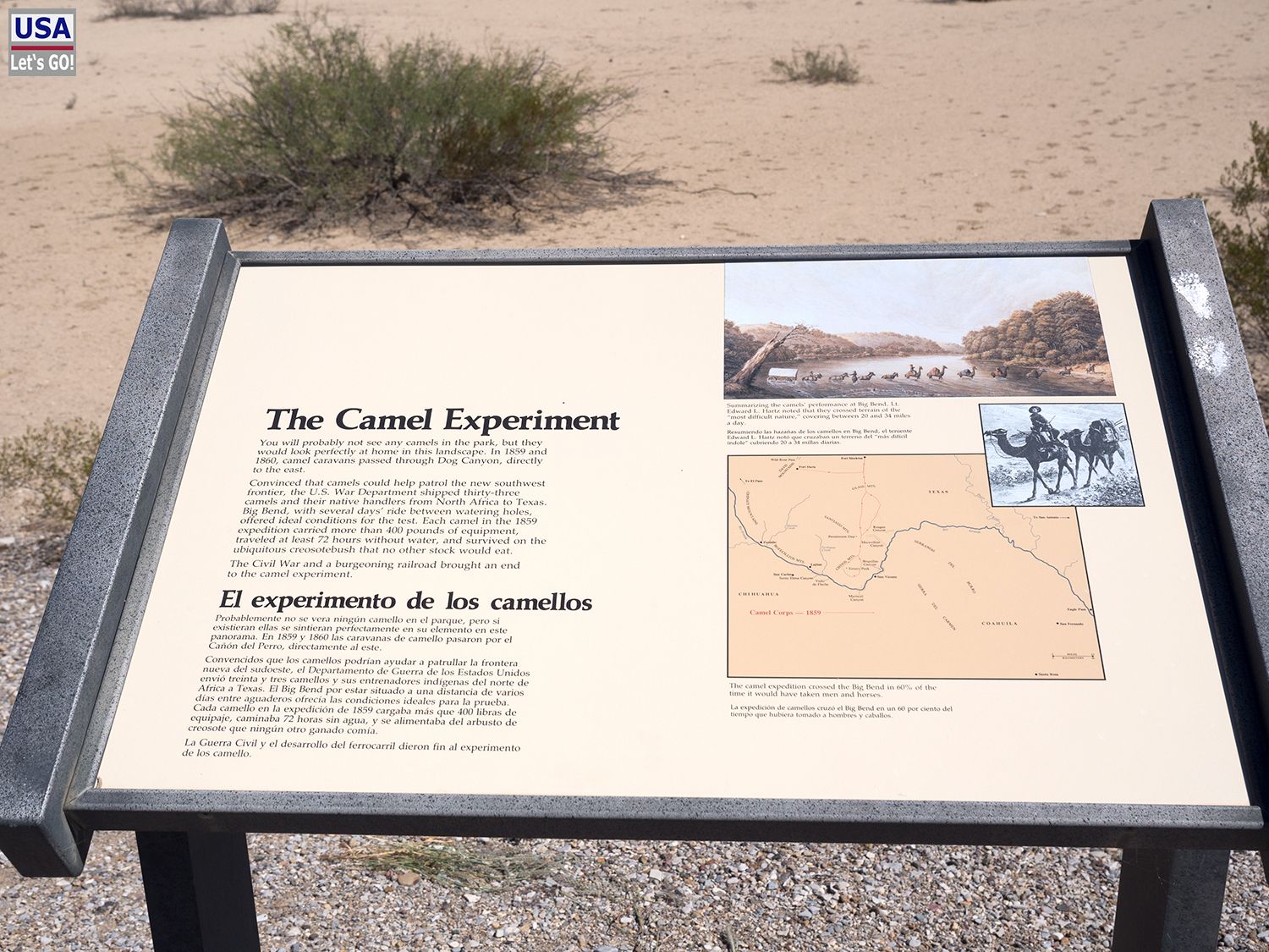 Dennoch halte ich kurz an und lese eine Infotafel, die besagt, dass hier während des Sezessionskriegs Kamele probeweise als militärische Nutztiere eingesetzt wurden. Klima und Vegetationsform passen ja auch ganz gut.