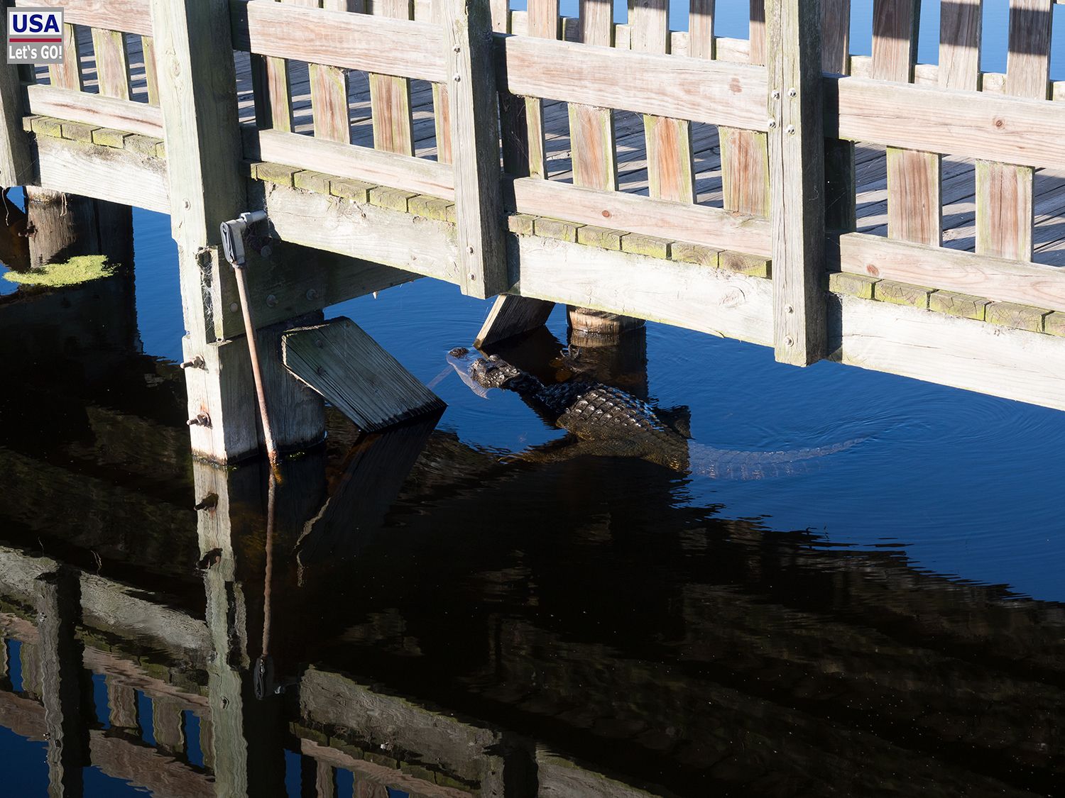 Auf der Suche nach Alligatoren in freier Wildbahn mache ich einen ca. einstündigen Spaziergang um den 40 Acre Lake und werde nicht enttäuscht. Schon gleich zu Beginn des Wegs befindet sich ein boardwalk und ich bekomme einen ersten Alligator zu Gesicht.