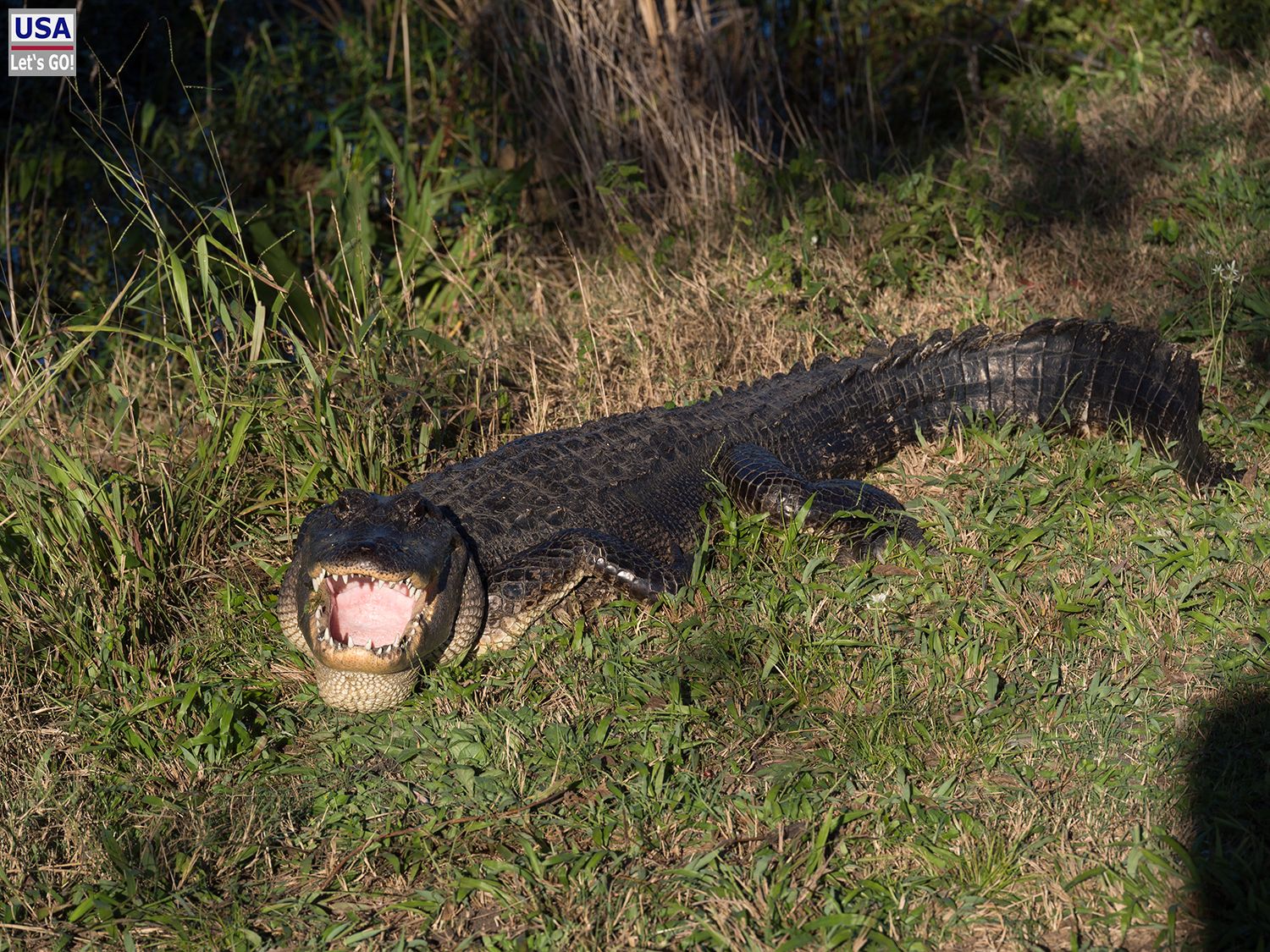 Ich gehe im Uhrzeigersinn um den 40 Acre Lake und staune nicht schlecht, dass dieses ca. drei Meter große Prachtexemplar am Wegesrand auftaucht und selbstbewusst demonstriert, dass es mit Karies und Parodontose keine Probleme hat.