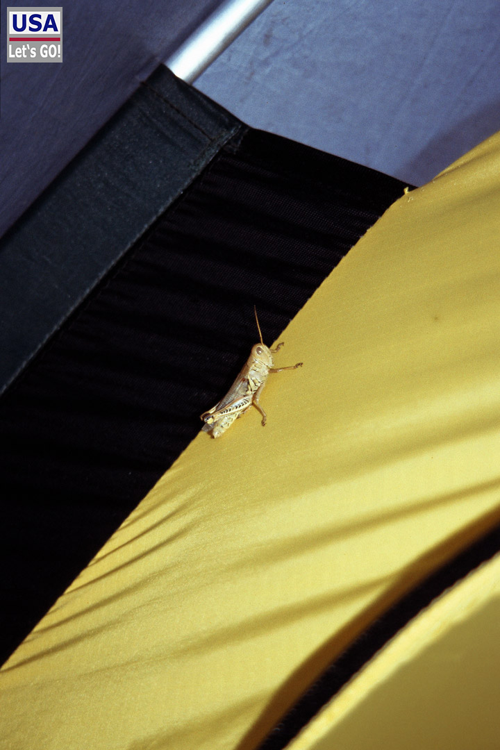 Müde und hungrig kamen wir beim Campingplatz an, wo sich Anja provisorisch den Staub des Tages abwusch. Besuch bekamen wir von einem schönen Grashüpfer, der sich auf unserem Zelt niederließ.