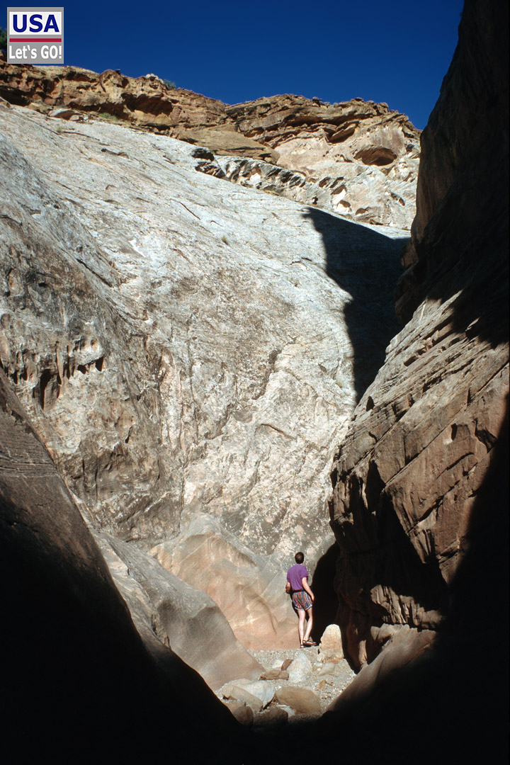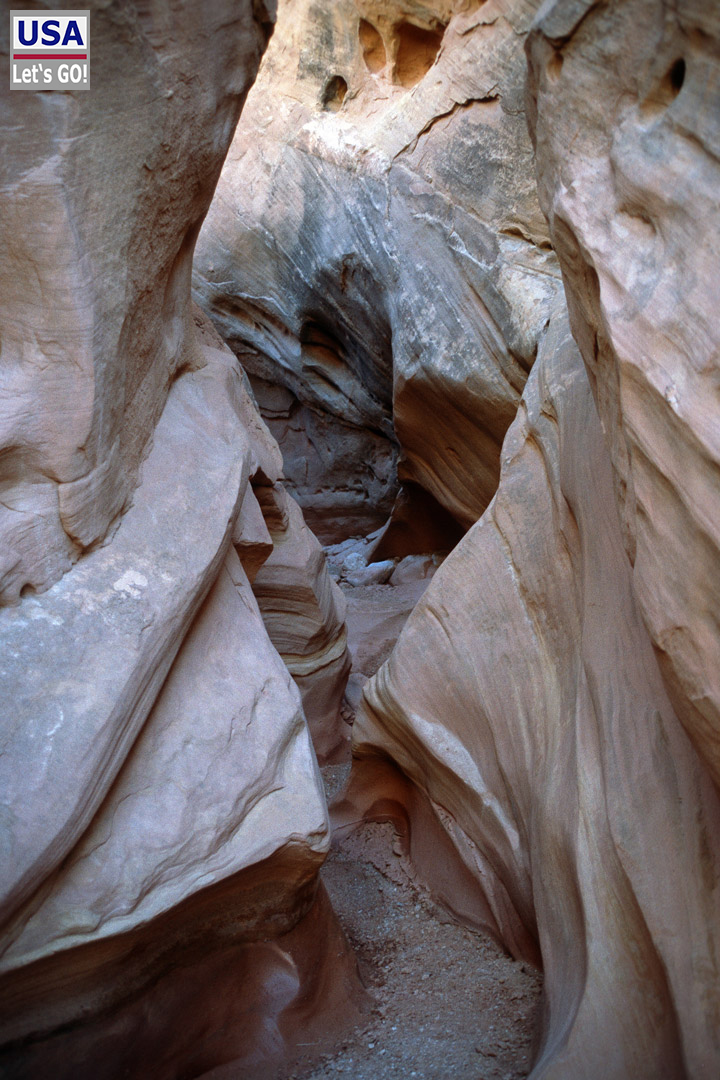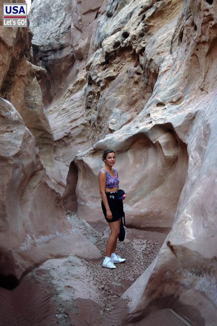 Ähh, tja, sind wir (leider) doch. Das war wohl die Stelle mit dem Wasserloch gewesen. Uns blieb keine Wahl: Wir marschierten strammen Schrittes zurück, wobei das Felshindernis von dieser Seite viel leichter zu bewältigen war. Diesmal nahmen wir bei der Weggabelung den richtigen Pfad und kamen bald wirklich in einen slot canyon (s. auch Bild oben rechts).