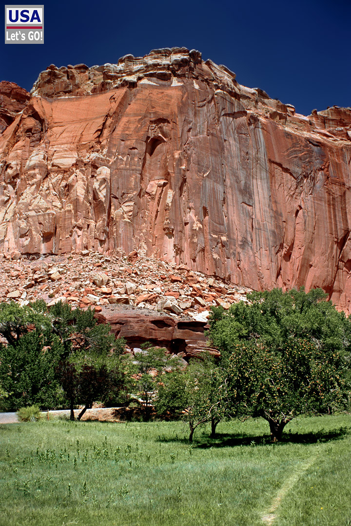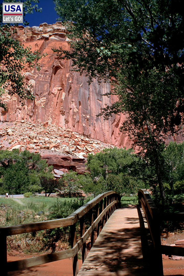 Nach dieser Sightseeing-Tour fuhren wir noch einmal nach Torrey, tankten und kauften Sandwiches. Dann ging es zurück nach Fruita. Wir gingen über eine wunderschöne Holzbrücke in die Obstgärten, wo es Äpfel, Birnen und Pfirsiche gab. Die grünen Bäume sahen vor der Hintergrundkulisse der roten Felsen fantastisch aus.