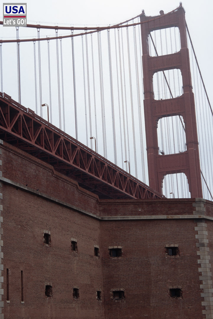 Am Dienstag stand San Francisco auf dem Programm. Wir fuhren zunächst über die Golden Gate Bridge zum Fort Point direkt unterhalb der Brücke (s. Bild links). Nachdem wir einen Ranger nach der Sicherheit des Parkplatzes gefragt hatten, ließen wir unser Auto dort stehen. Zunächst gingen wir noch etwas näher an die Brücke heran und ich machte ein paar Fotos von dem berühmten Bauwerk, das glücklicherweise nicht vom Nebel verhüllt war.