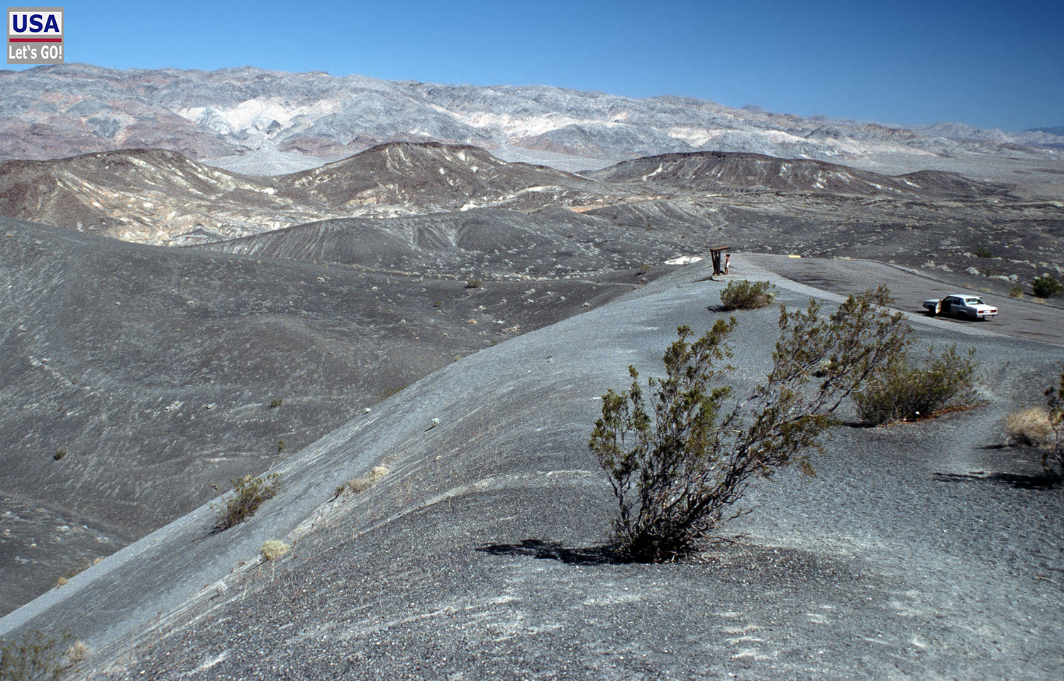 Nach einer Ruhepause und dem Besuch im Visitor Center fuhren wir zum nahegelegenen Ubehebe Crater, der ca. 800 m Durchmesser hat und mitten in der Lavawüste liegt. Hier war es herrlich einsam - eine faszinierende Landschaft.