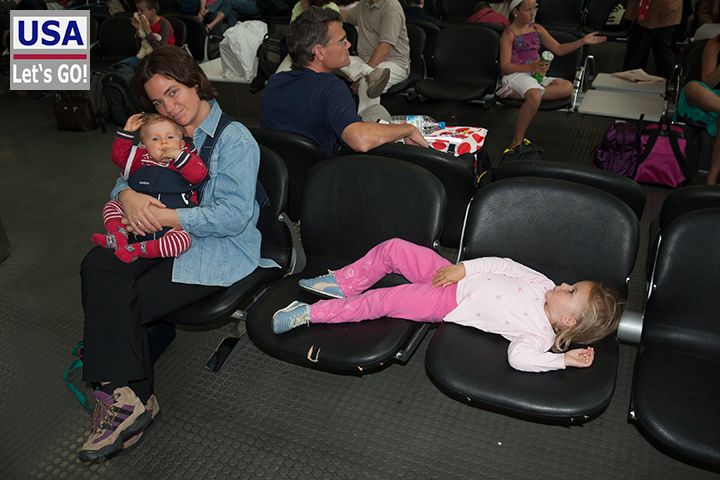 Am nächsten Morgen ließen wir uns zum Flughafen in Frankfurt bringen und harrten der Dinge, die da kommen würden. Wie man auf dem Bild bei Anja sieht, waren wir Erwachsenen total übermüdet, da wir in der ungewohnten Schlafumgebung kein Auge zu bekommen haben. Vielleicht war das auch schon das Adrenalin wegen der bevorstehenden Reise.