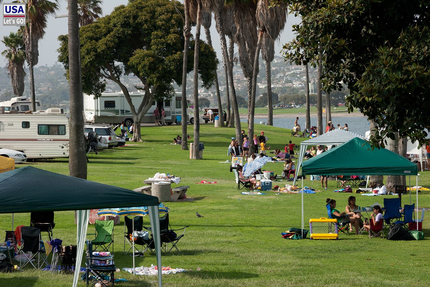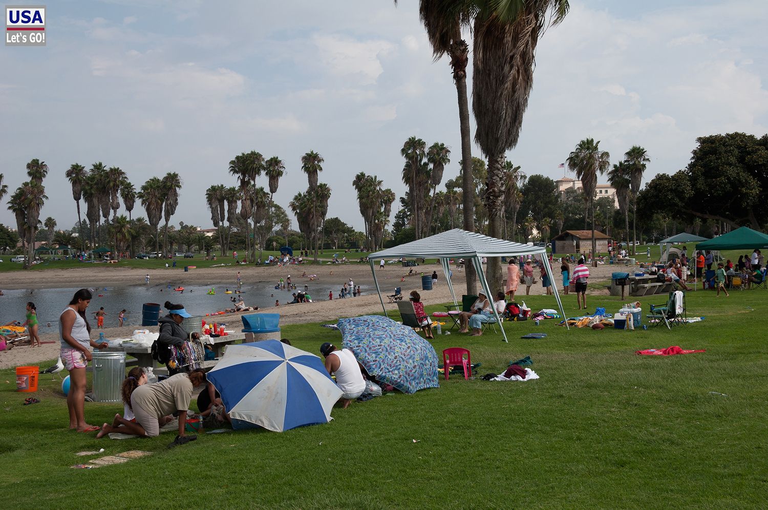 Wir ließen uns auf einer der großen Rasenflächen nieder und hörten ab sofort kein einziges deutsches Wort, dafür aber umso mehr Spanisch. Die Mission Bay ist bei Einheimischen, und in San Diego sind davon sehr viele hispanischen Ursprungs, sehr beliebt. Touristen zieht es hingegen wohl eher an die großen Pazifikstrände, wie z.B. Mission Beach oder Ocean Beach.