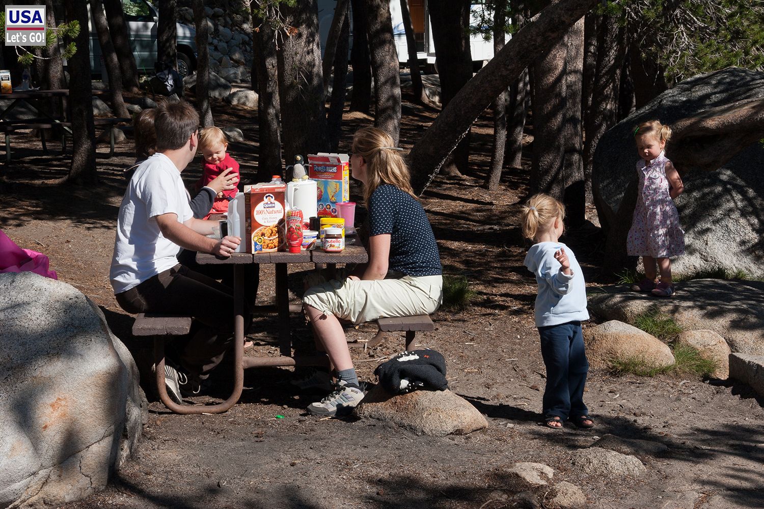 Das Frühstück verlagerten wir an den Tenaya Lake, den wir Carolin, Christian und Laura unbedingt zeigen wollten. Dort saßen wir bei einer picnic area und ließen es uns gut gehen. Mittlerweile waren schon drei kleine Kinder an Bord, die sich freuten so oft miteinander spielen zu können.