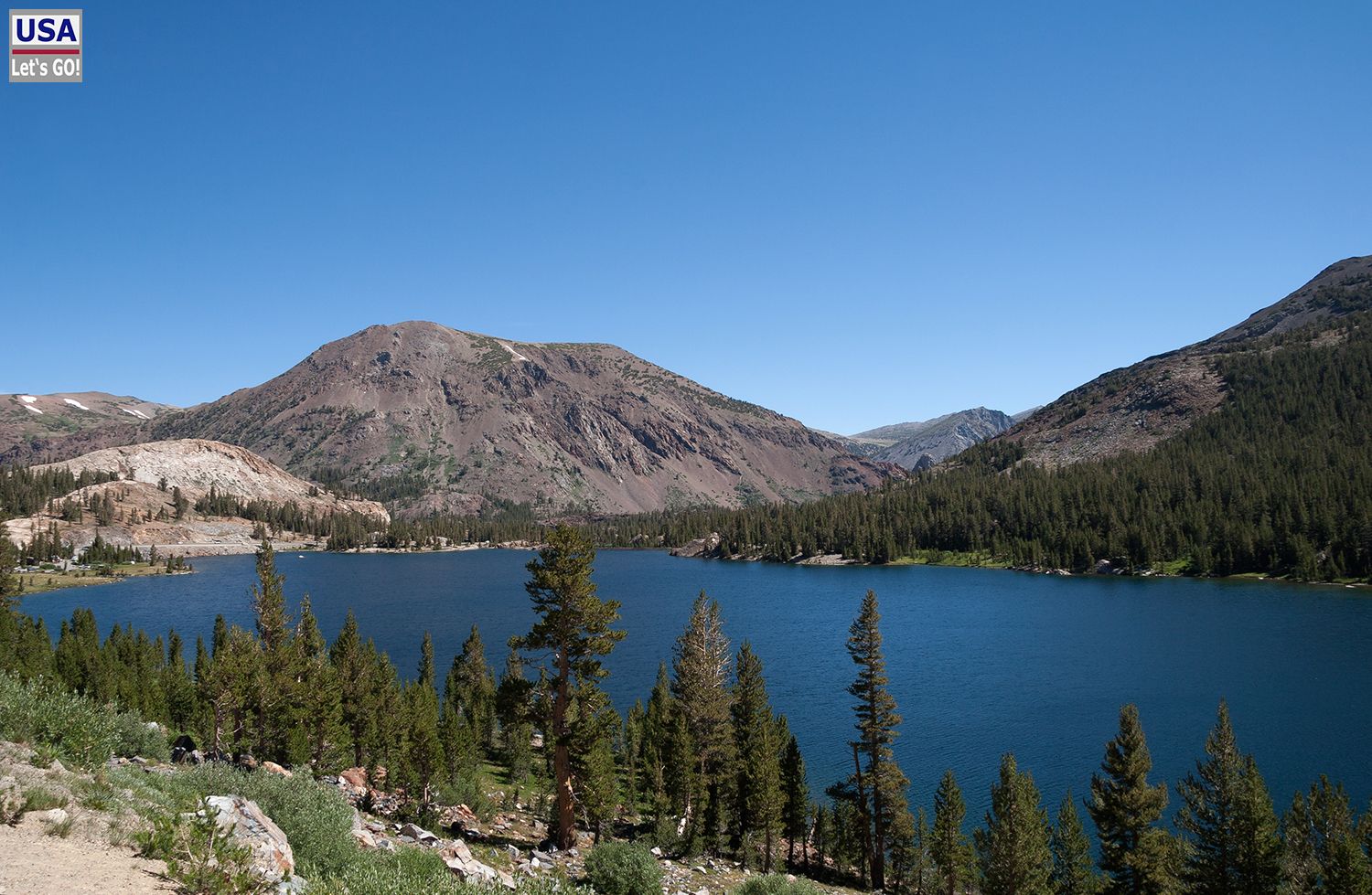 Kurz darauf verließen wir den Yosemite Nationalpark durch den Osteingang. Von dort waren wir gekommen. Den Ellery Lake sahen wir nun von der anderen Seite. Offenbar hat der See zwei Schokoladenseiten, denn auch von hier gefiel macht er keine schlechte Figur.