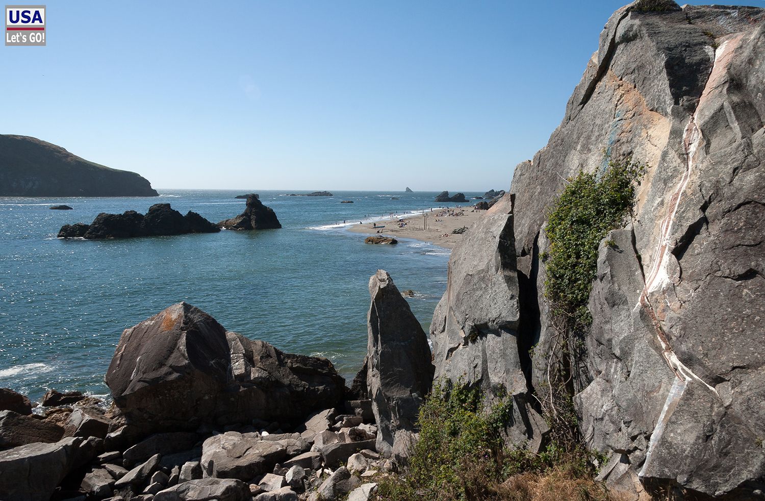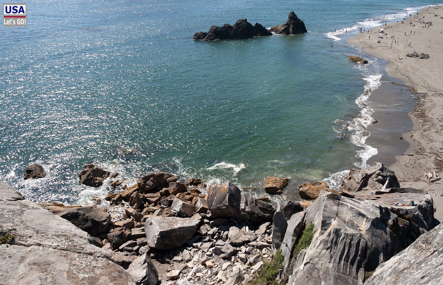 Da es erst mittags war, hatten sich die marine layers noch nicht vollständig verzogen. Die großen Felsen, für die der Harris Beach SP bekannt ist, sahen schemenhaft unwirklich aus. Obwohl das Wetter für Strandaktivitäten noch nicht optimal war, kamen schon einige Leute in freudiger Erwartung auf besseres Wetter an den Strand. Sie wurden nicht enttäuscht, denn es klarte nach und nach auf.