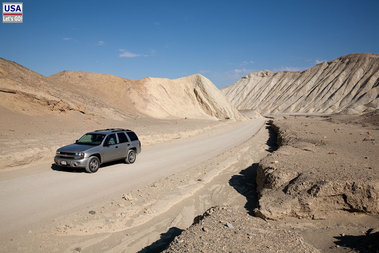 Weit über der zulässigen Geschwindigkeit von 35 mph sauste ich den Coffin Peak wieder hinunter und fuhr zur nächsten Station, dem Twenty Mule Team Canyon. Hier sollte es eine schöne dirt road geben, für die wir bei unseren vorherigen Besuchen nie das richtige Gefährt hatten. Der Trailblazer sollte das locker schaffen.