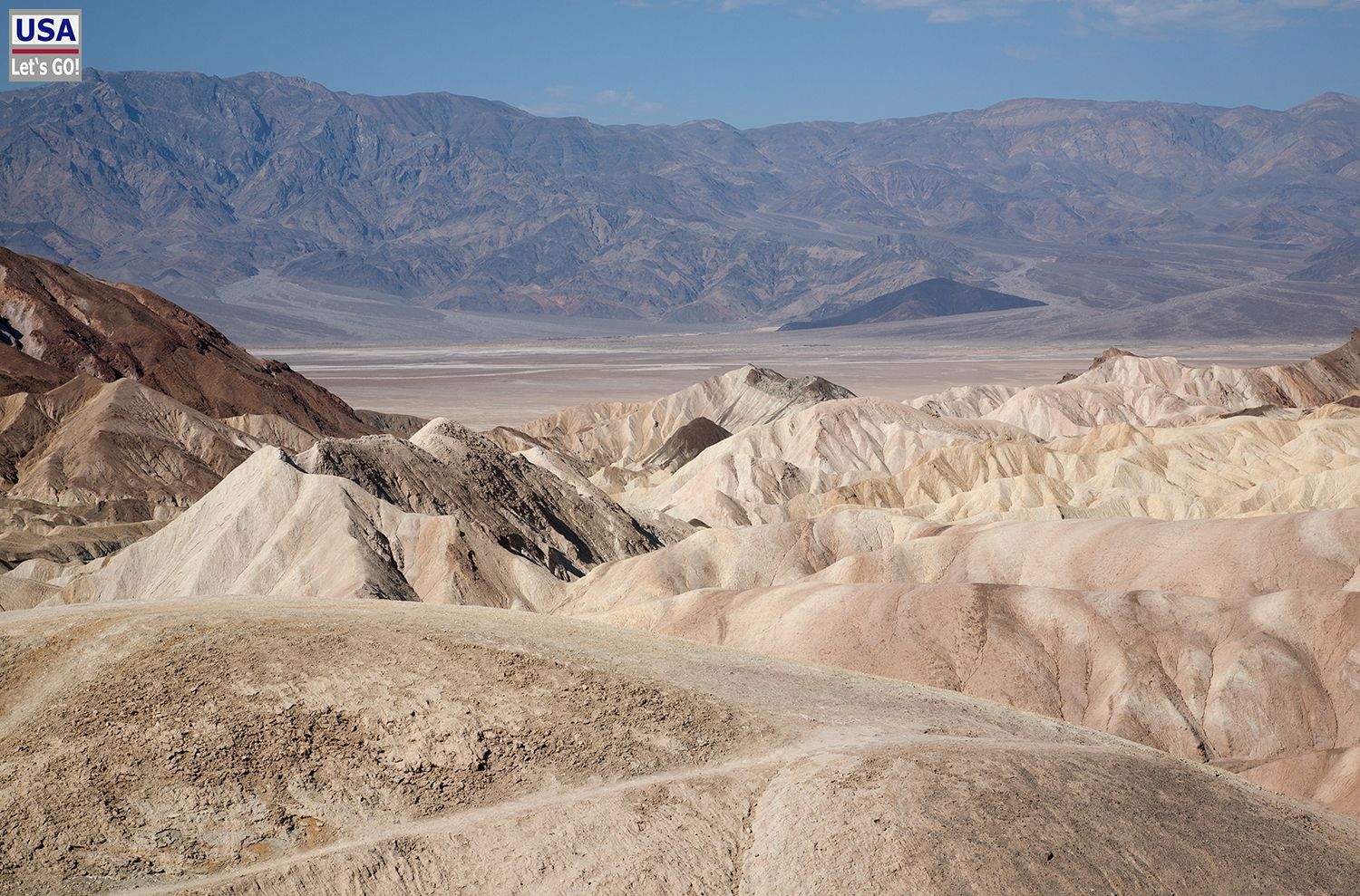 Ich kam am Zabriskie Point vorbei, an dem man einfach anhalten muss. Vor allem morgens, wenn die Berge von der noch tief stehenden Sonne in zartes Licht getaucht werden und noch nicht Busladungen voller Touristen unterwegs sind.