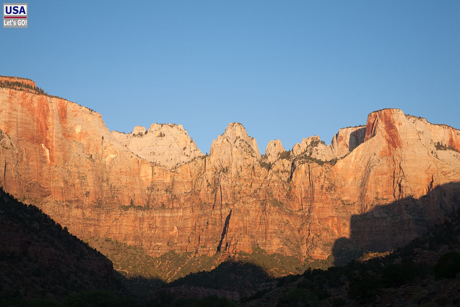 Die Towers of the Virgin und der West Temple leuchteten orange. Ein erhabener Anblick, bei dem ich langsam die Müdigkeit aus den Knochen bekam.