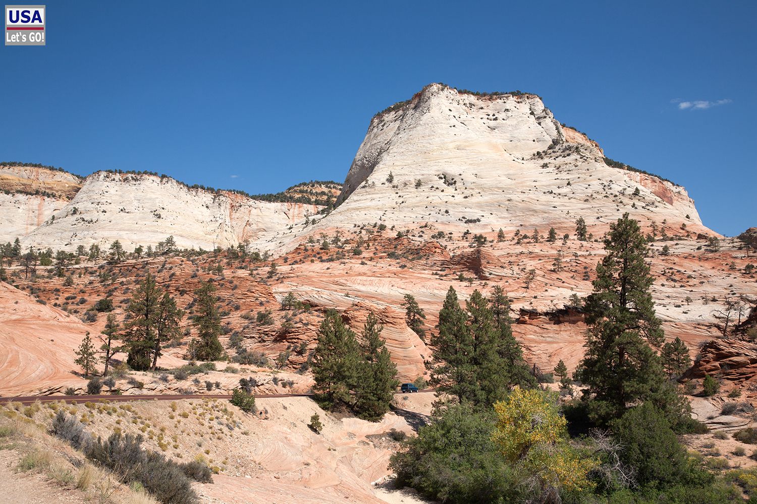 Als ich wieder am Wagen war, fuhr ich durch den Tunnel weiter Richtung Osteingang. Das rote Band der Parkstraße, hier Zion-Mount Carmel Highway genannt, führt durch eine faszinierende Landschaft.