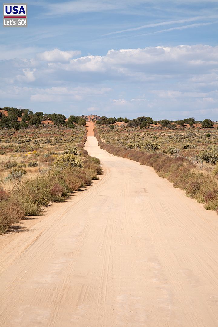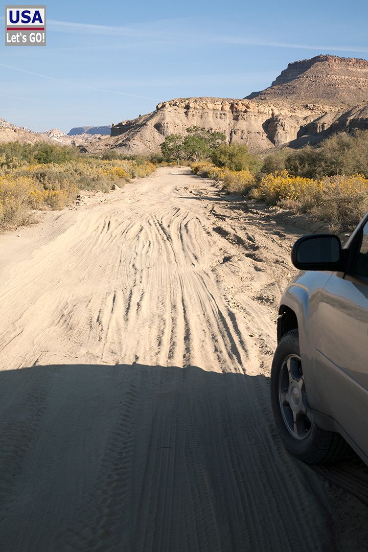 Auch die kleine Piste, die zum Arch führt, hat optisch ihre Reize (s. Bild links). Weiter Richtung Norden kommt eine leicht abschüssige Passage zum Round Valley Draw (s. Bild rechts).