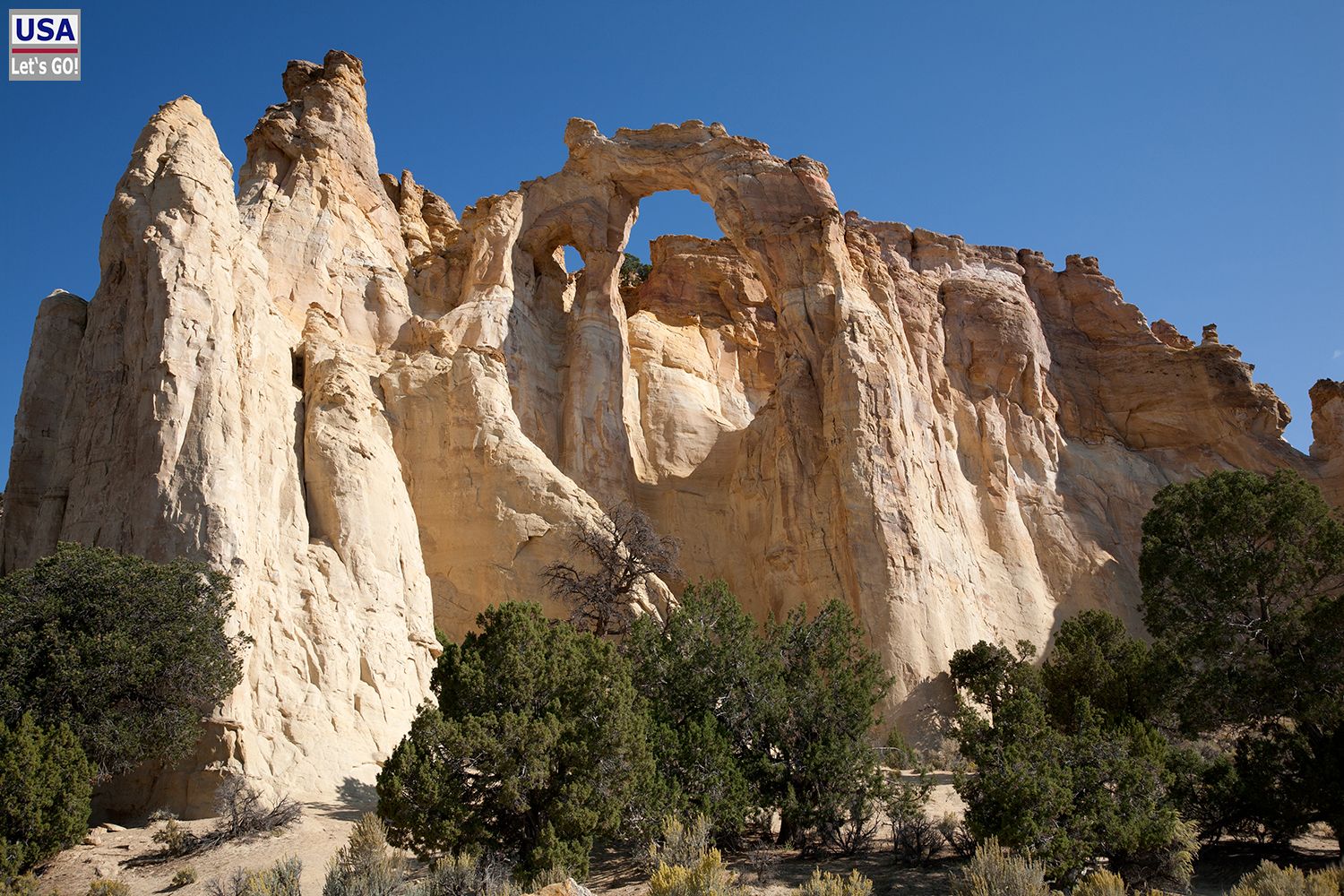Nach ca. 30 Meilen nahm ich die Abzweigung nach rechts zum Grosvenor Arch. Majestätisch erhob sich der Felsbogen über der Landschaft und muss dabei keinen Vergleich zu seinen berühmteren Artgenossen im Arches NP scheuen.