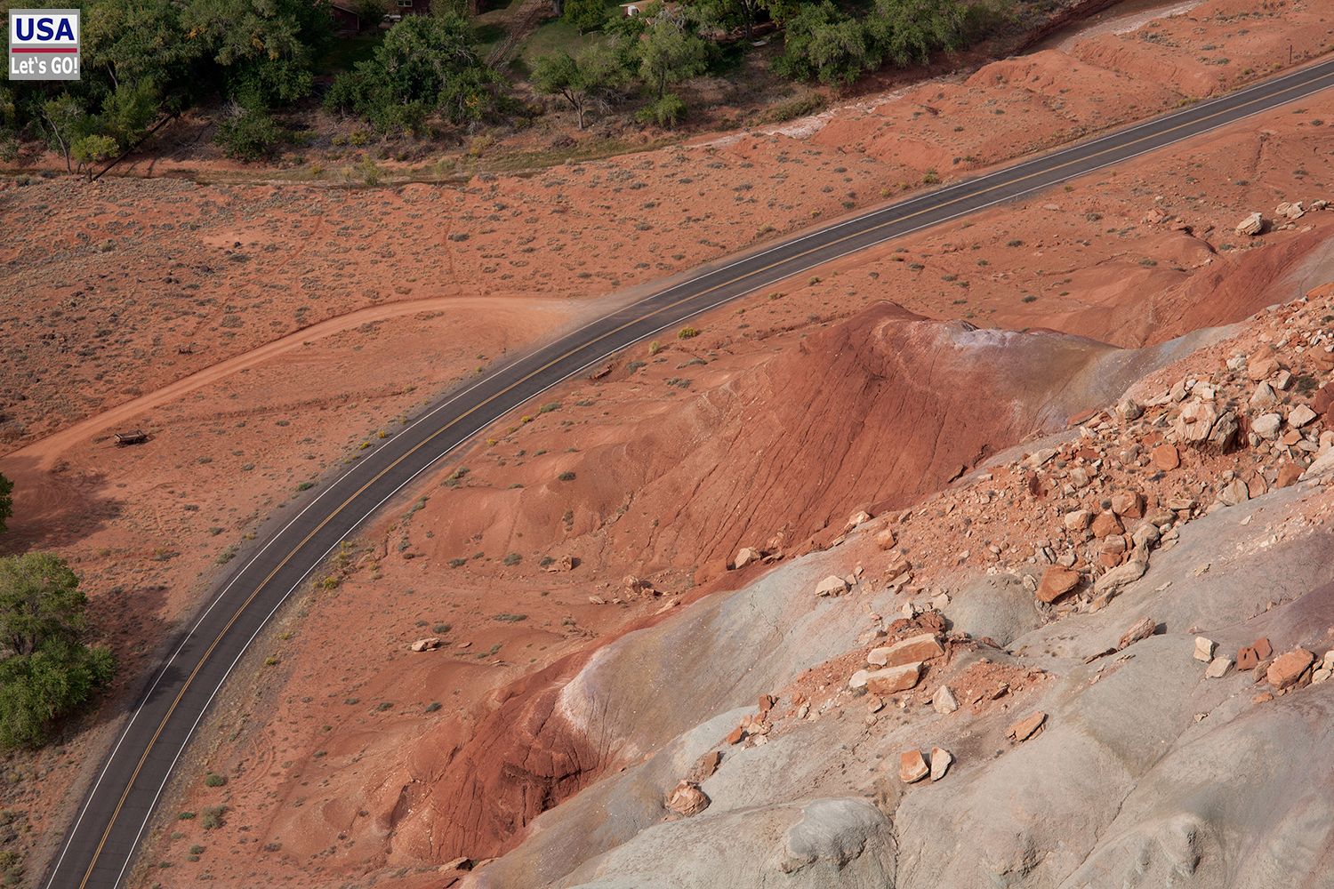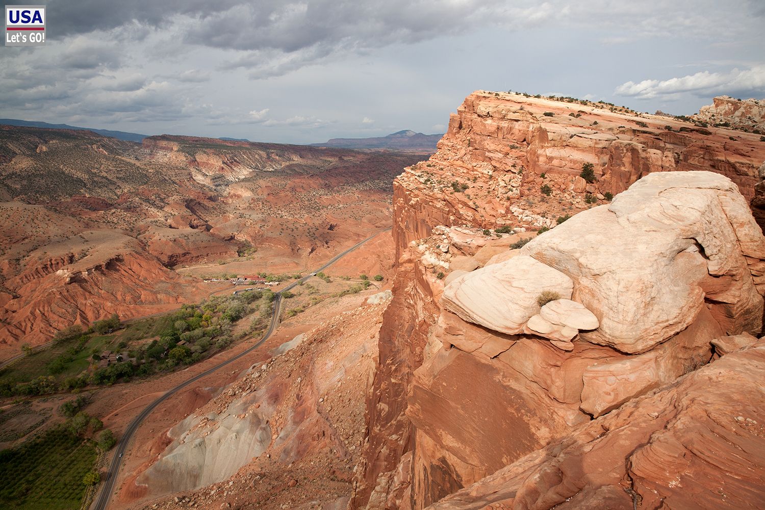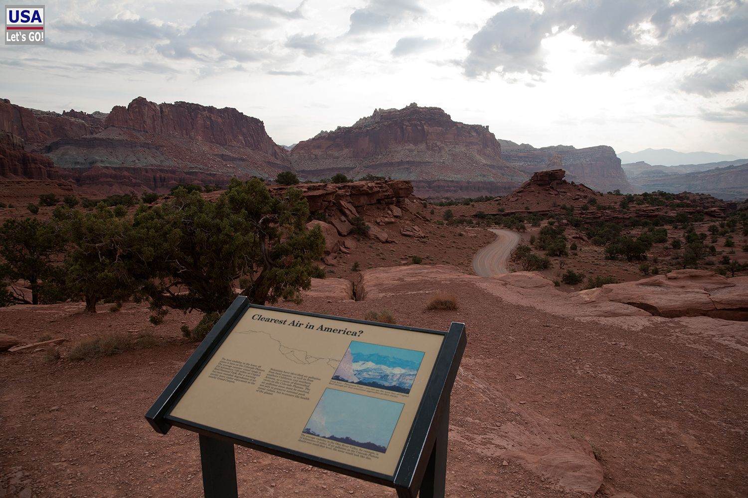 So gestärkt fuhr ich die UT 24 Richtung Osten zum Capitol Reef Nationalpark. Dort machte ich einen kurzen Stopp beim Panorama Point, der aber nachmittags wesentlich fotofreundlicher ist. Da ich entsprechende Bilder aber schon in früheren Urlauben gemacht hatte, war das Gegenlicht diesmal kein Problem.