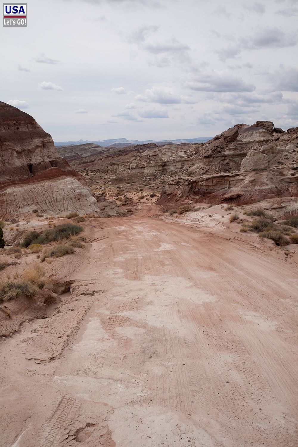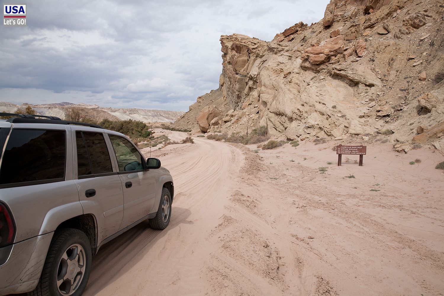 In dem völlig bedeutungslosen Kaff Caineville, man könnte auch sagen in the middle of nowhere, zweigt die nicht asphaltierte Caineville Wash Road ab, die im weiteren Verlauf Cathedral Valley Road heißt, und in einen abgelegenen Teil des Capitol Reef NP führt. Das Cathedral Valley stand schon lange auf meiner Liste. Fraglich war nur, ob das Wetter halten würde.