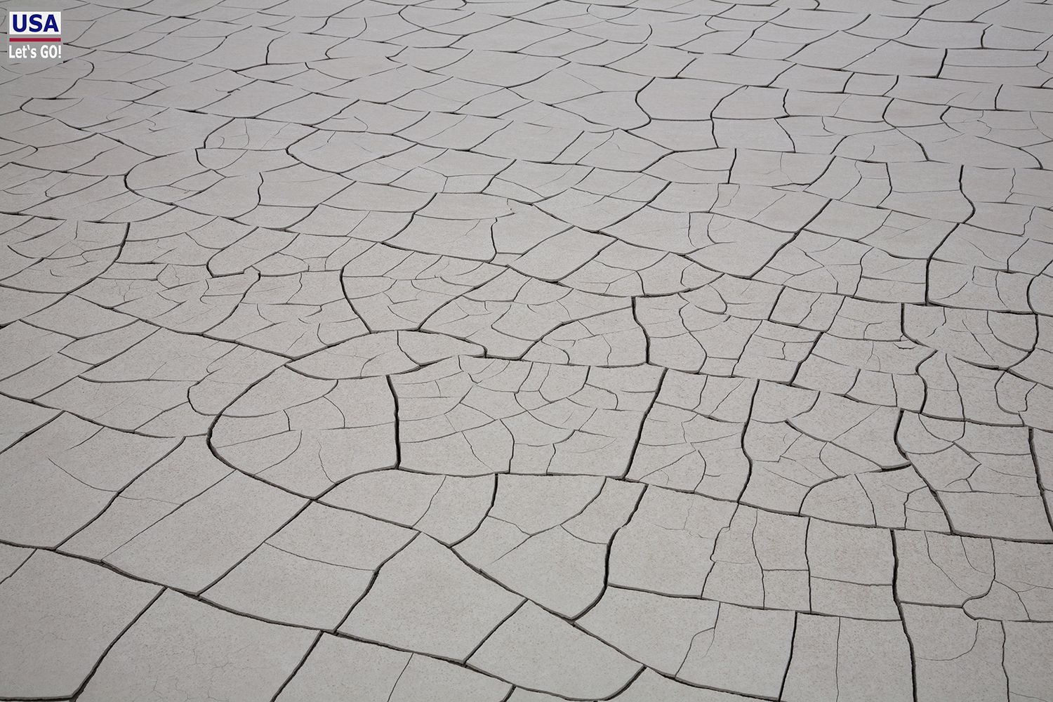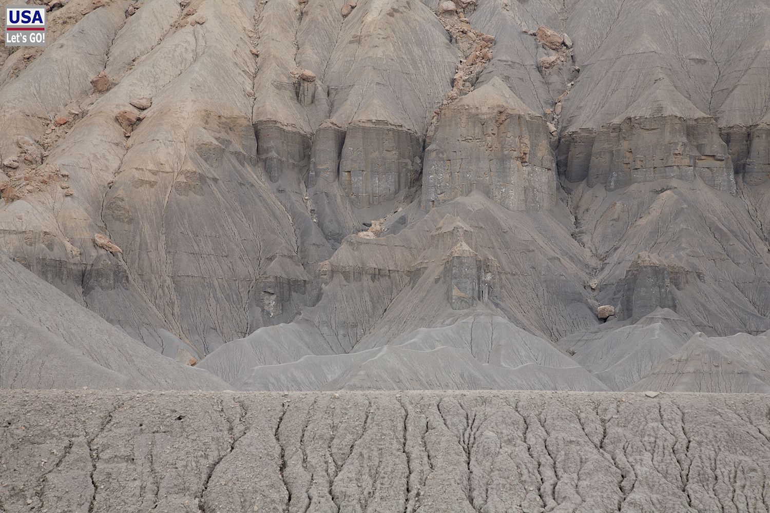 In der Nähe von Caineville gibt es interessante grau-ockerfarbene buttes und mesas. An einer Stelle sah der Boden großflächig aus, wie ein vom Bildhauer geschaffenes Kunstwerk (s. Bild oben).