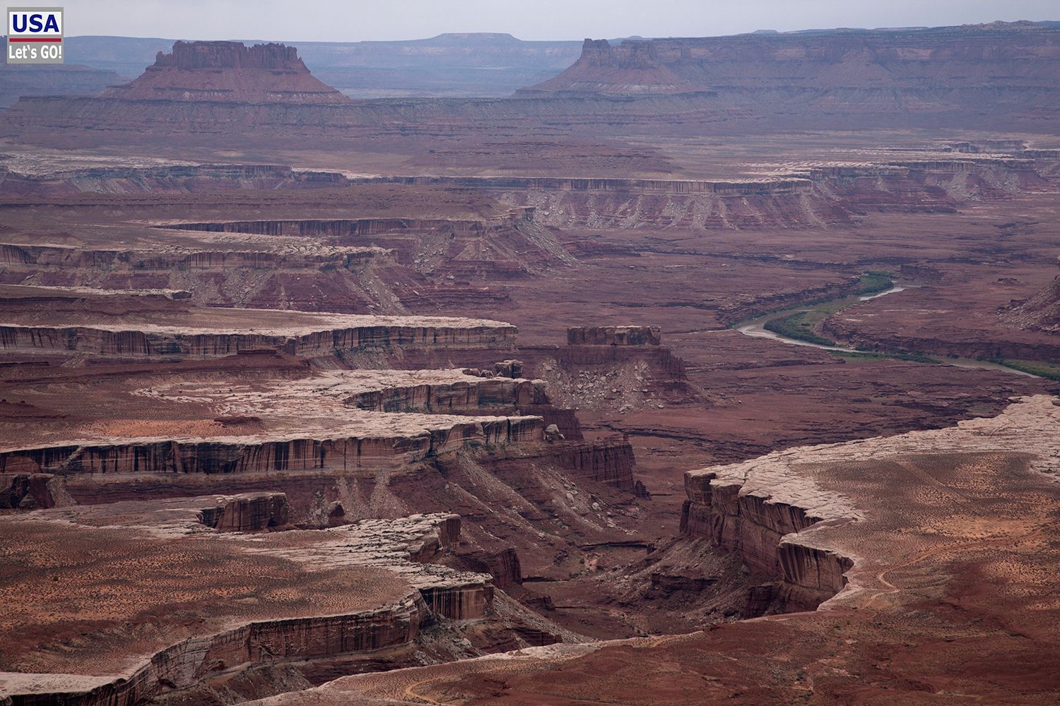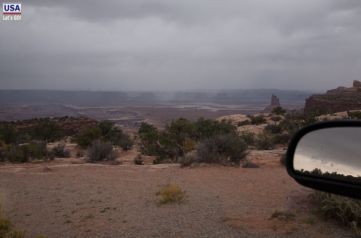 Kann man nicht ändern. Ich holte mir einen Starbucks-Coffee in der Lobby und fuhr dann gemütlich los zum Canyonlands NP. Eigentlich hatte ich vor den Shafer Trail zu fahren. Ich fragte im Visitors Center einen Ranger, ob der Shafer Trail befahrbar sei und er meinte bei vorsichtiger Fahrweise sollte es mit 4WD ok sein. Fand ich eine mutige Einschätzung, denn es regnete.