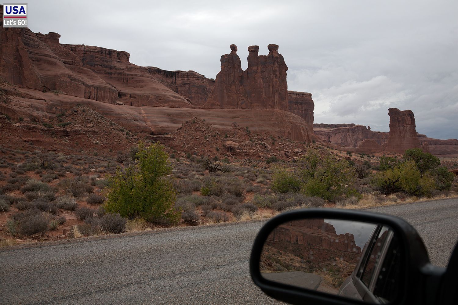 Meinen Lieblings-Viewpoint (La Salle Mountains Viewpoint) ließ ich ausnahmsweise rechts liegen und fuhr weiter zu den Courthouse Towers. Fotografieren im Freien war noch immer kein Thema, also schön im trockenen Auto sitzengeblieben.