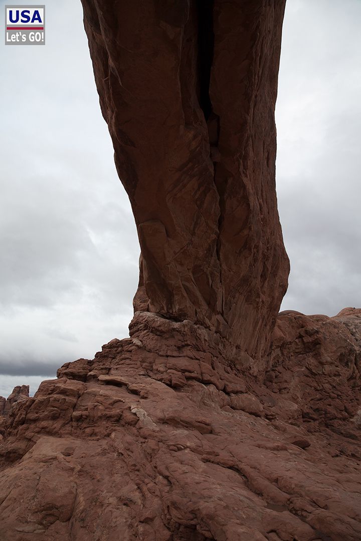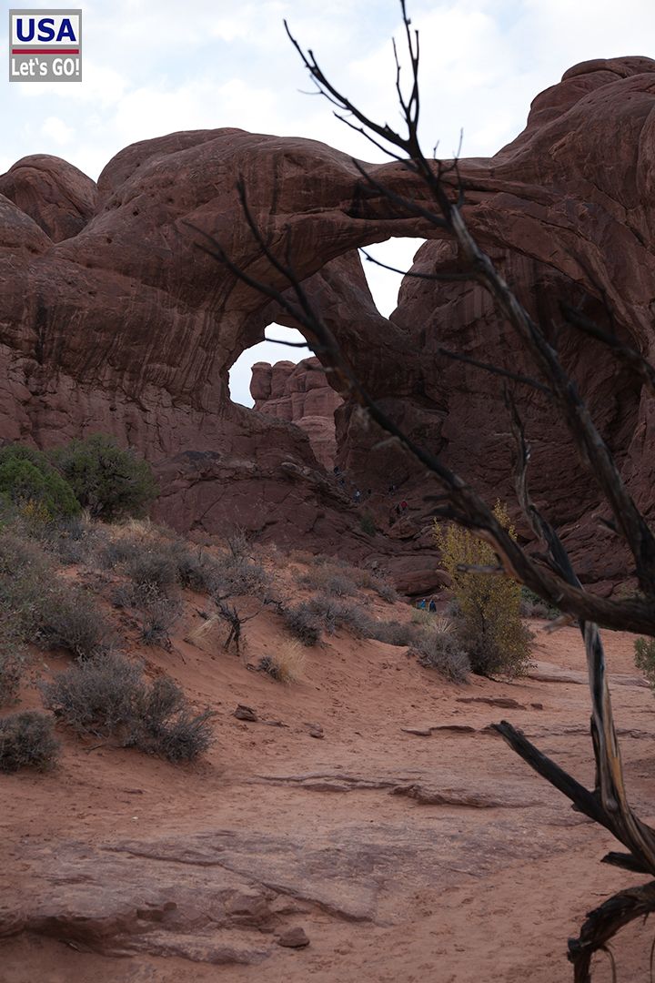 Hmm, Richtung Osten (Devils Garden) sah es immer furchtbarer aus. Ich entschied mich wenigstens noch bis zur Windows Section weiterzufahren. Dort erwischte ich eine Regenpause und konnte so wenigstens den kurzen trail zum South Window machen (s. Bild links) und den Double-O-Arch fotografieren (s. Bild rechts).
