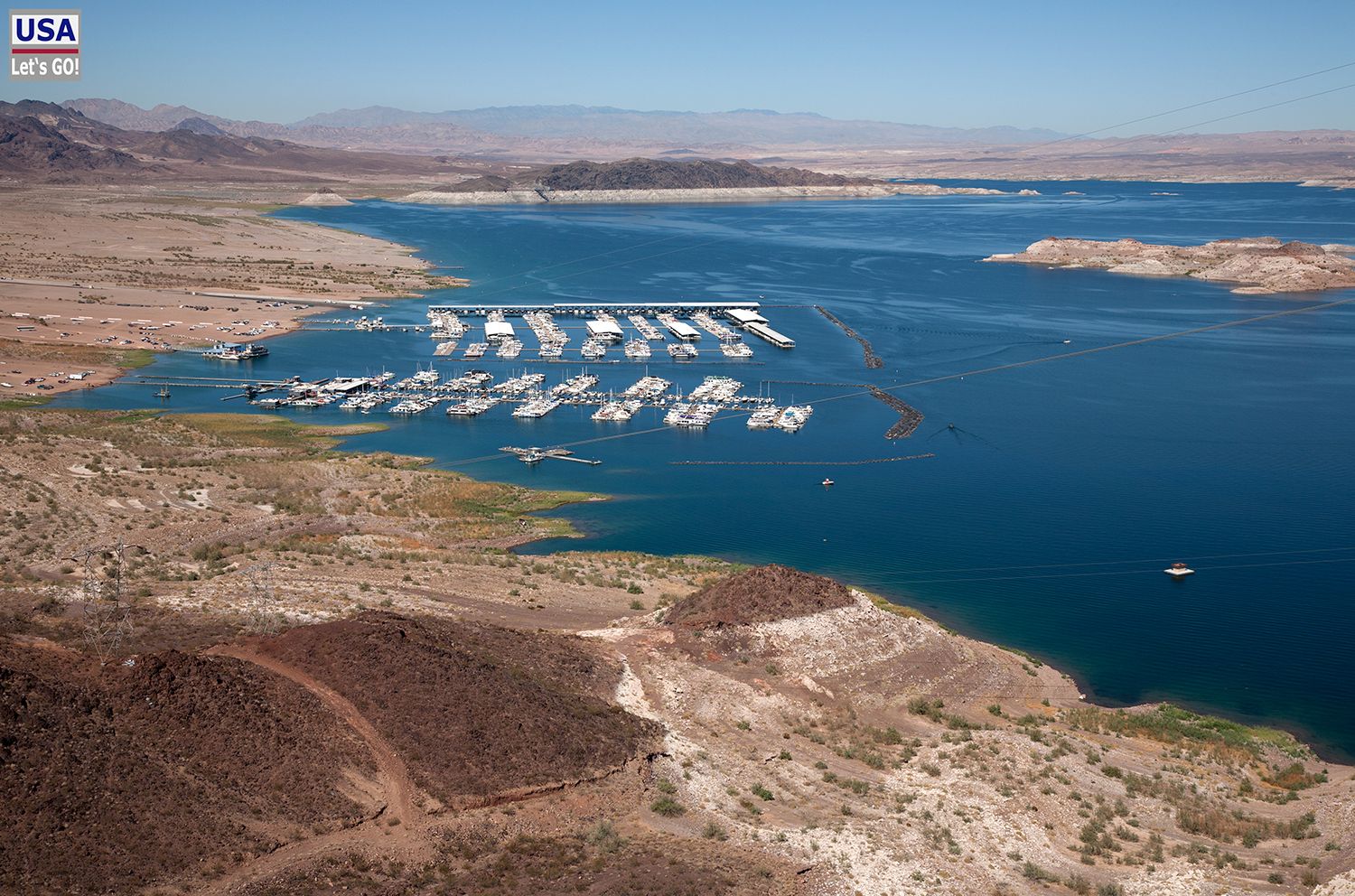 2008 war die Großbaustelle Hoover Dam Bypass ja noch nicht fertig, sodass ich noch direkt über die Staumauer fahren konnte. Am nördlichen Nevadaende nahm ich noch den schönen Lakeview Overlook mit. Unter mir das türkise Wasser des Lake Meads und die gleichnamige Marina in der Horsepower Cove.