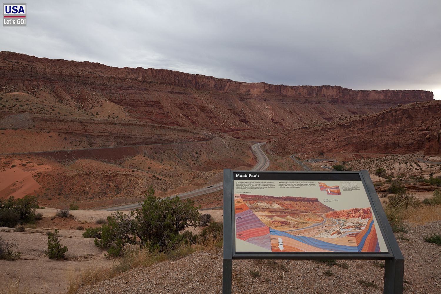 Kurz nach dem Parkeingang ist der Moab Fault Viewpoint der erste Overlook im Arches Nationalpark.