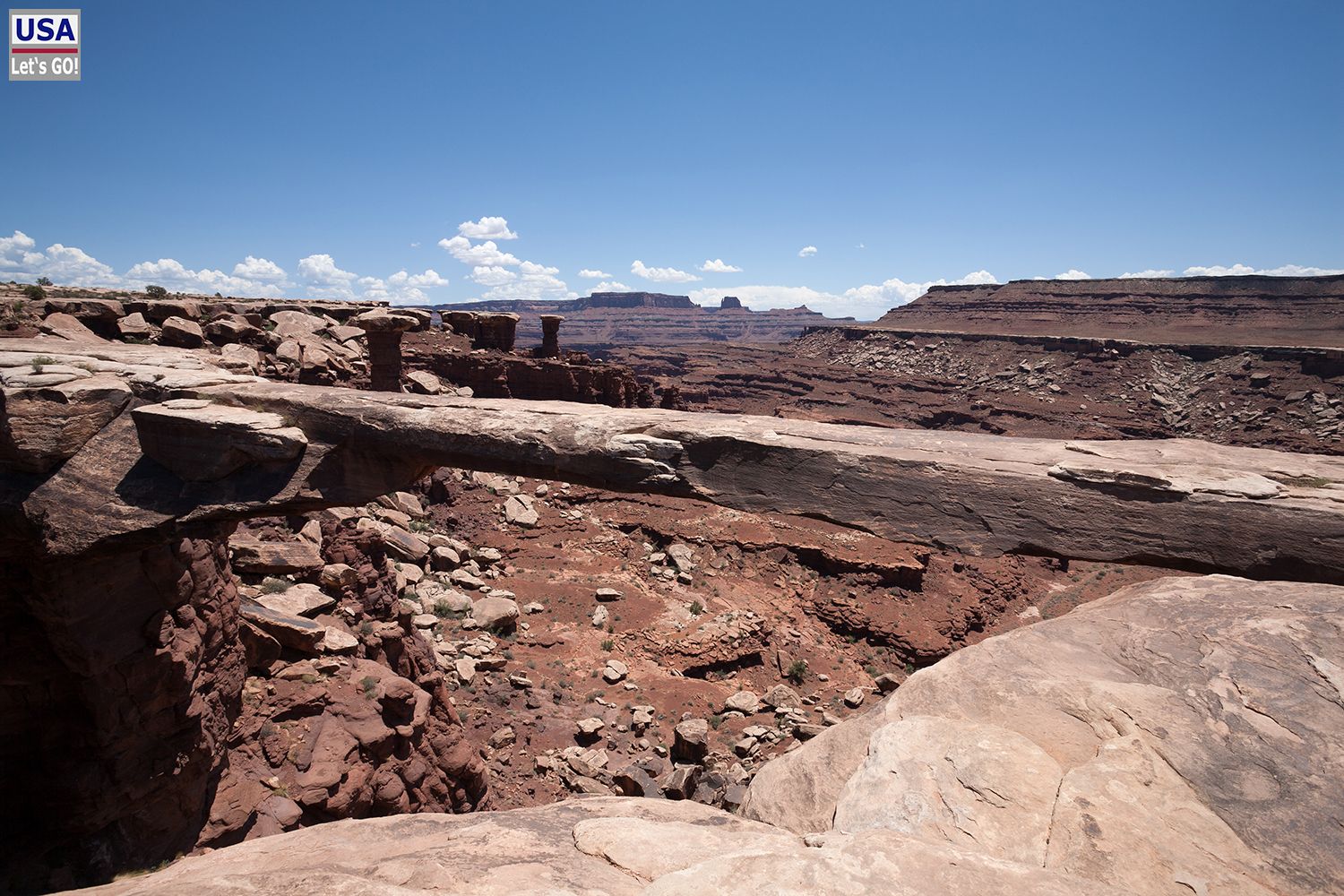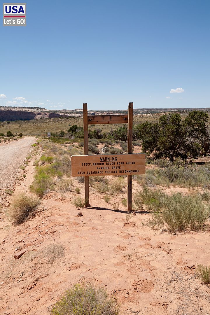 Bevor ich auf die Potash Road abbog, die mich nach Moab bringen sollten, nahm ich noch das kurze Stück der White Rim Road mit, das zum Musselman Arch führt. Allerdings ließ ich den Wagen etwa hundert Meter vor dem Arch stehen, denn die Straße war hier ziemlich fies. Wenn es zu Fuß zu weit gewesen wäre, hätte ich mich schon fahrenderweise weiter getraut, aber so wollte ich keine unnötigen Risiken eingehen. Der Expedition hatte zwar eine gute Bodenfreiheit, aber die Reifen waren doch eher für normale Straßenverhältnisse ausgelegt und nicht, wie z.B. bei einem Jeep Wrangler, fürs Gelände optimiert.