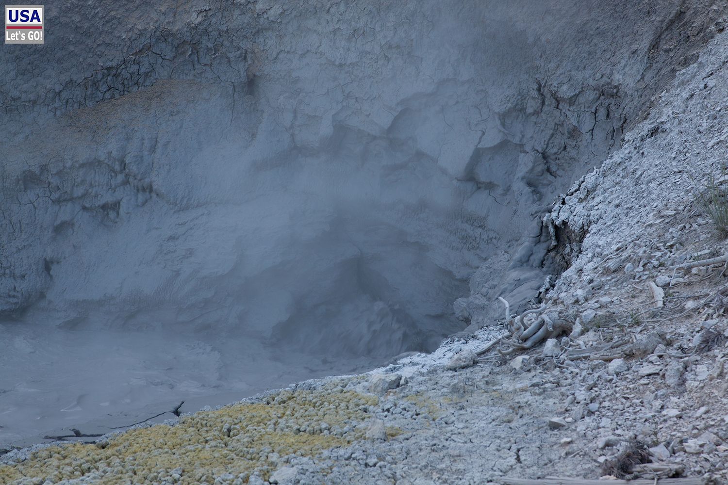 Nachdem es in Canyon Village ja nicht geklappt hatte, wollten wir übernachtungstechnisch nun irgendwo am Yellowstone Lake unser Glück versuchen. Also hieß es nach dem Besuch des Grand Canyon Kurs nach Süden nehmen. Beim Mud Volcano machten wir einen Stopp.
