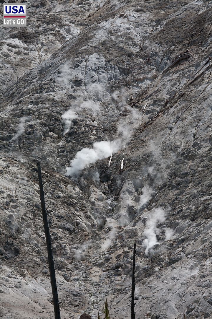 Dann fuhren wir den gleichen Weg zurück, den wir gestern Abend gekommen waren. Beim Mud Volcano und der Sulphur Caldron hielten wir noch einmal für ein paar Fotos.