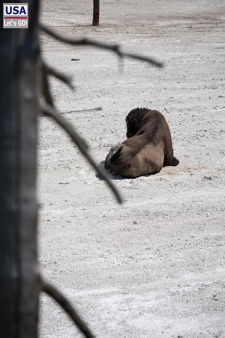 In Canyon Village hielten wir uns links und fuhren Richtung Norris. Dort bogen wir nach Norden ab und kamen bald zum Roaring Mountain. Nicht gerade ein feuerspeiender Vulkan, aber hier und da dampfte und zischelte es. Ein paar Bisons hatten es sich bequem gemacht.