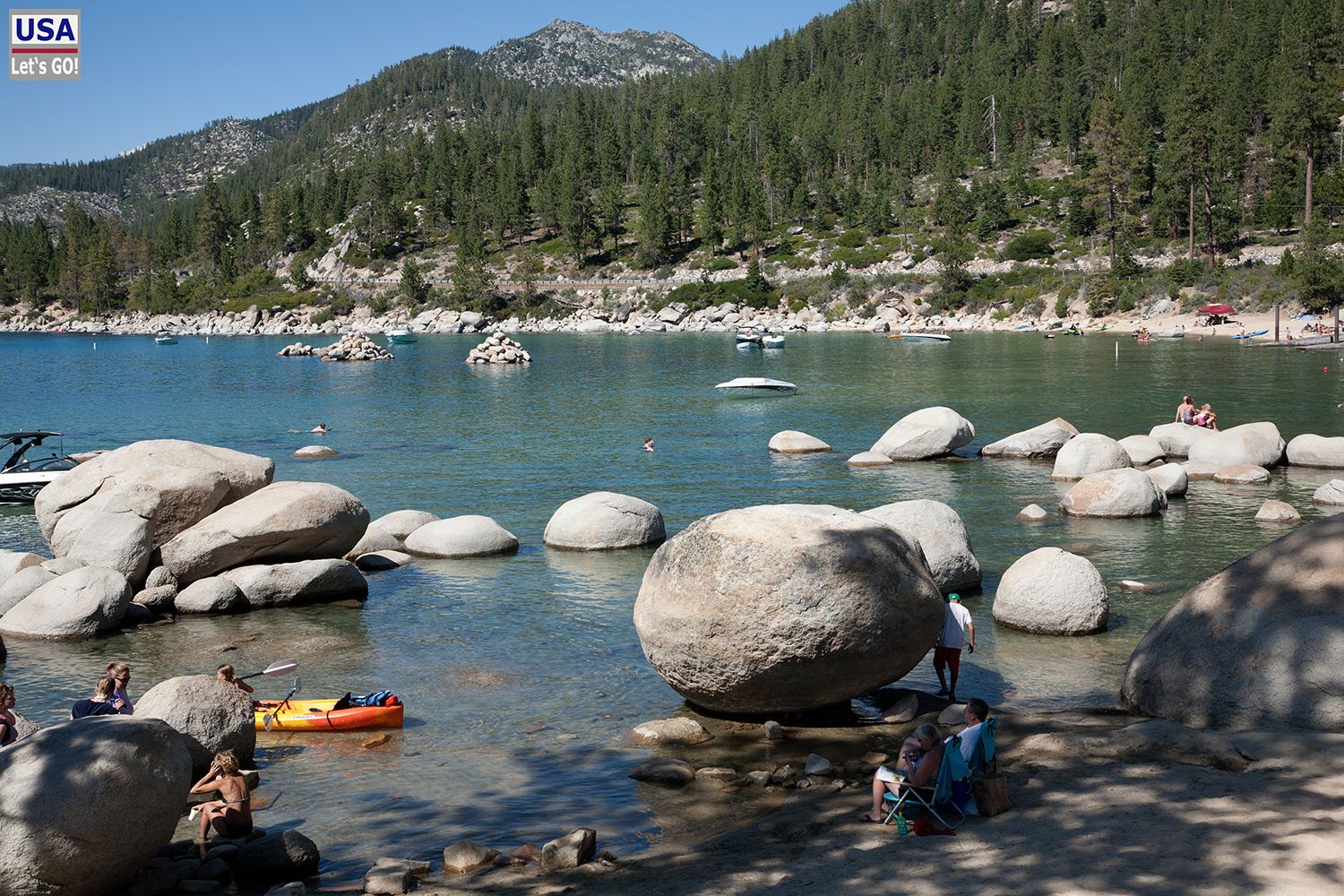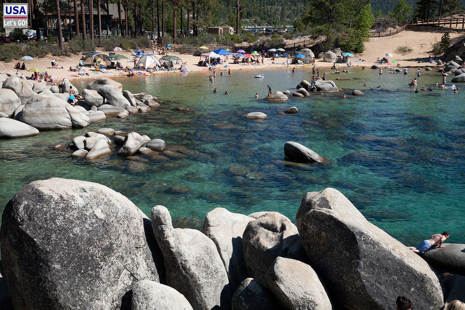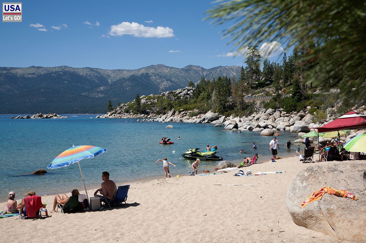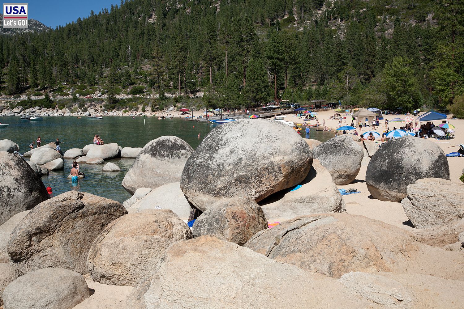 Den Sand Harbor State Park hatten wir als Bade-Location ausgewählt, doch leider hatten wir diese Idee nicht exklusiv. Mit unserem sperrigen 25"-RV war es ein Abenteuer einen Parkplatz zu ergattern, was selbst mit einem normalen PKW häufig schwer hinzubekommen ist.