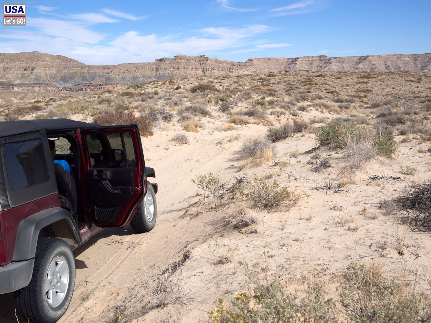Ich habe leichte Zweifel, ob das eine gute Idee ist, da ich in all den vielen Reiseberichten, die ich über diese Region studiert habe, noch nirgendwo auf diese alternative Route gestoßen bin. Andererseits haben wir einen Jeep und notfalls können wir immer noch umkehren. Also riskieren wir es und begeben uns auf den White Sands Jeep Trail.