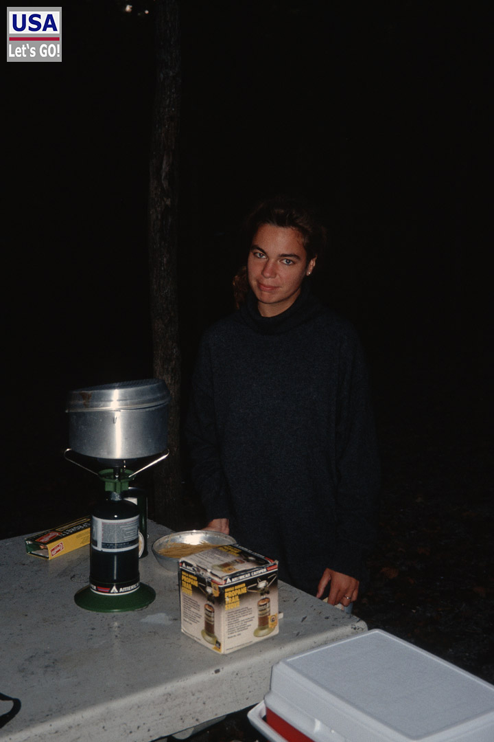 Wir checkten auf einem Campingplatz ein. Umgeben von dichtem Wald versuchte Anja unseren etwas schwächlichen Kocher in Gang zu bekommen um Spaghetti zu kochen (s. Bild links). Das Ende vom Lied: Es war stockdunkel, die Nudeln wurden immer noch nicht richtig warm und wir gingen hungrig schlafen (s. Bild rechts).