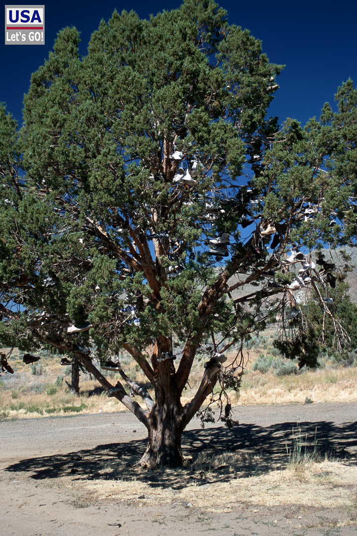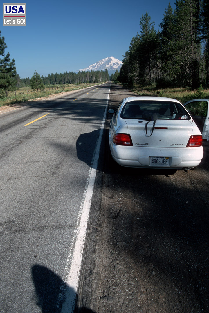 Wir fuhren in nordwestlicher Richtung. Dabei kamen wir an einem dieser merkwürdigen shoe trees vorbei (s. Bild links). Je weiter wir nach Norden kamen, desto mehr bestimmte der Puderzuckergipfel von Mount Shasta das Landschaftsbild.