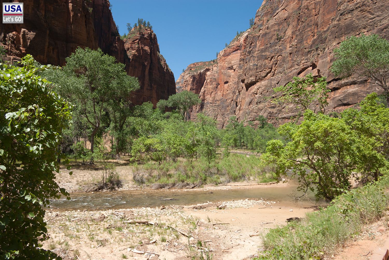 Insgesamt ging der Weg leichter, als ich zunächst befürchtet hatte. Als ich wieder beim Rest der Familie war, die mit dem Zion Shuttle nachgekommen waren, war ich zwar klitschnass aber noch relativ fit. Einem gemütlichen Spaziergang am Riverside Walk stand nichts entgegen.