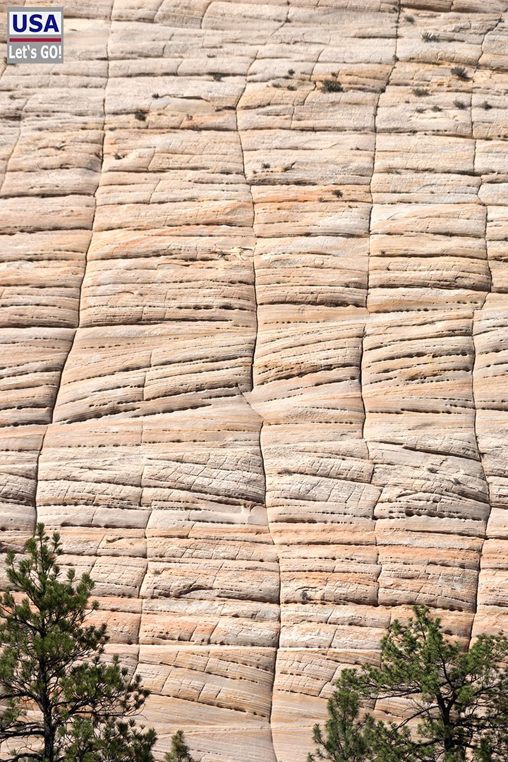Nachdem wir gegen eine Extra-Gebühr den Zion-Tunnel durchquert hatten - der Verkehr musste für unser Riesenmobil gestoppt werden, da wir wegen der geringen Tunnelhöhe nur in der Fahrbahnmitte fahren konnten - machten wir bei der Checkerboard Mesa eine kurze Pause und bewunderten die interessante Maserung dieses gigantischen Felsens.
