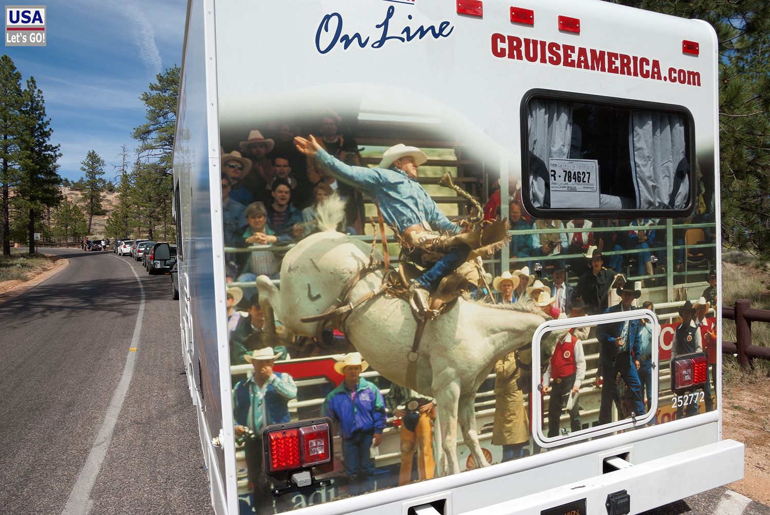 Hier mal ein Bild vom Hinterteil unseres Gefährts. Die knalligen Cruise America Aufkleber fand ich zunächst ziemlich naja, aber nach einer Weile der Gewöhnung gar nicht schlecht.