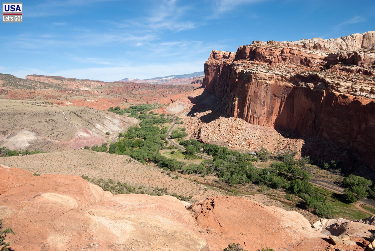 Höhepunkt des trails war für mich der Ausblick vom Fruita Overlook. Unter mir lag das graue Band der UT 24, die sich durch die atemberaubend schöne Landschaft des Capitol Reef Nationalparks schlängelt.