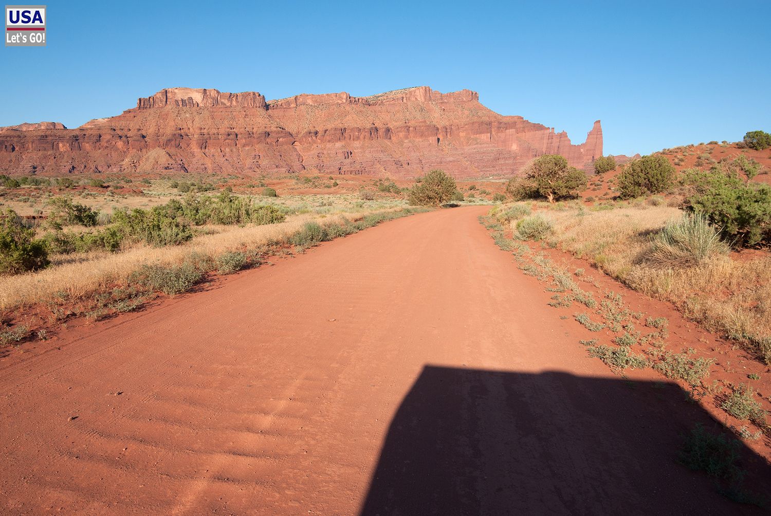 Wenig später kehrten wir um und fuhren zurück auf dem gleichen Weg zurück. Als wir wieder zum Highway 128 kamen, hielten wir uns rechts und machten einen Abstecher zu den Fisher Towers. Die nicht-asphaltierte Strecke war auch für unser RV ohne Probleme befahrbar.