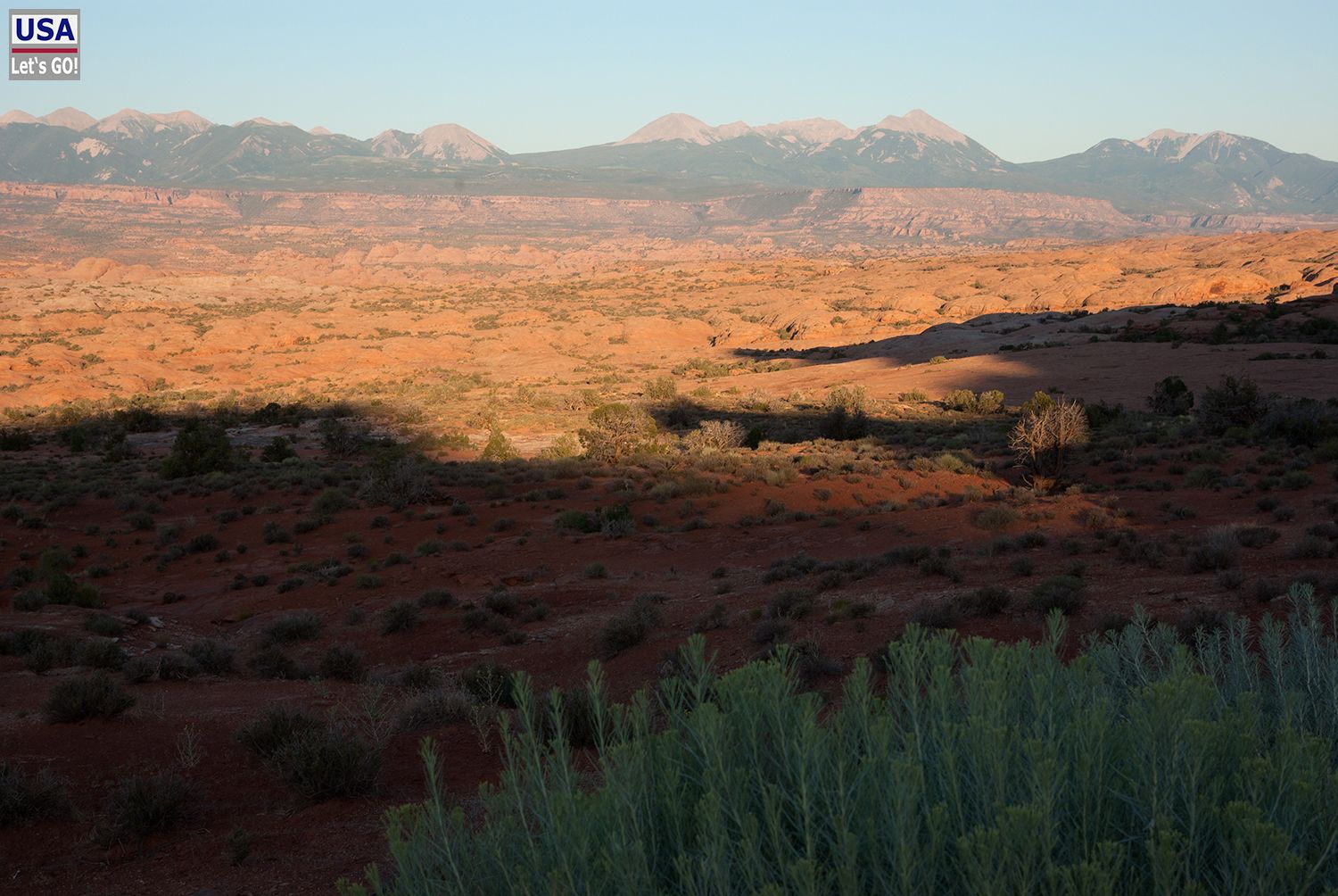 Die Sonne stand jetzt, um 18.30 Uhr, schon relativ tief, aber noch war die Gelegenheit für gute Fotos gegeben. Wir beeilten uns zum Arches Nationalpark zurückzukehren und machten am La Sal Mountains Viewpoint einen Fotostopp. Perfektes Licht, aber viel später hätten wir nicht sein dürfen.