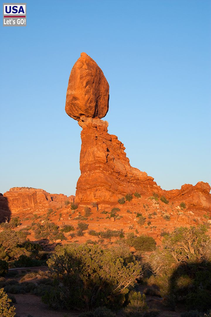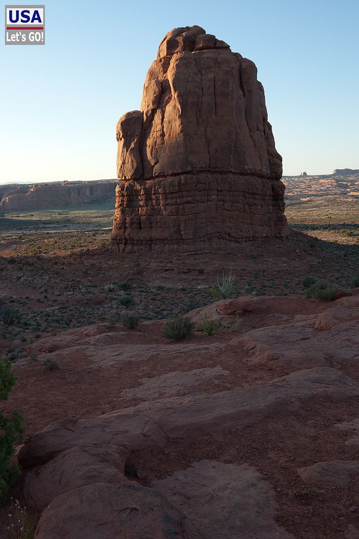 Auch der Blick nach Norden war nicht schlecht (s. Bild links). Beim Balanced Rock hielten wir ebenfalls und machten einen kurzen Spaziergang (s. Bild rechts). Der Felsen balancierte in grandiosem Licht. Unglaublich, welche Färbung Navajo- und Entrada-Sandstone annehmen können.