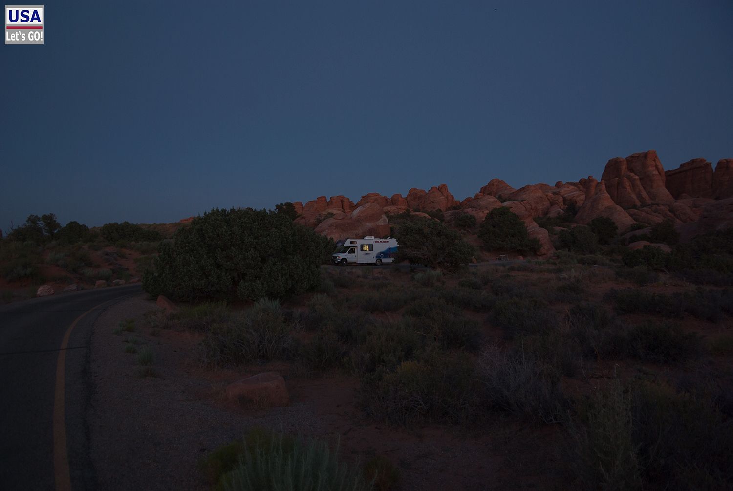 Langsam wurde es Zeit zum Campingplatz zurückzukehren. Als es fast komplett dunkel war, versuchte ich mich noch mit ein paar Lowlight-Aufnahmen. Das Wohnmobil im Bild war unseres. Hatten wir nicht eine klasse campsite?