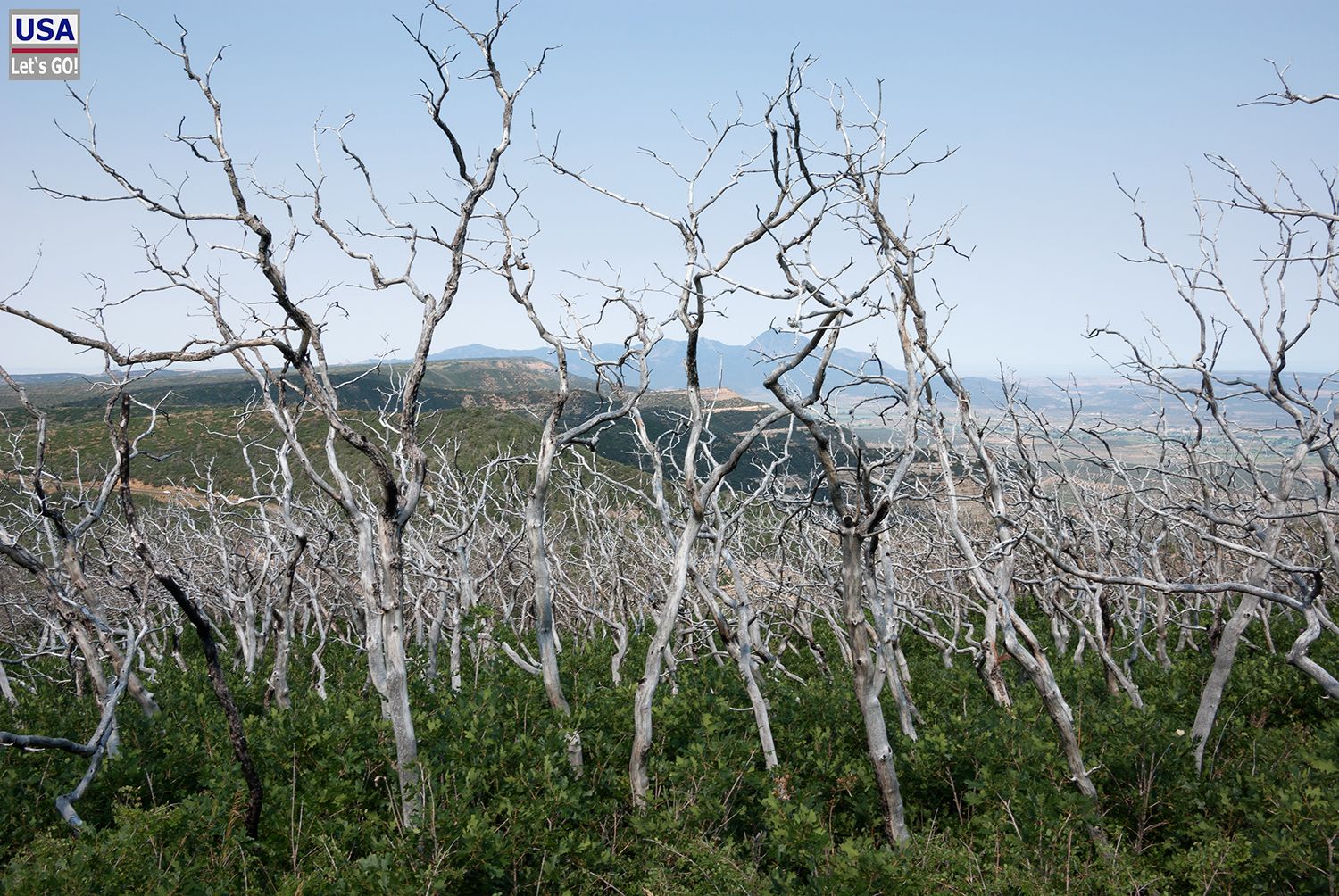 Beim Park Point erreichten wir den höchsten Punkt im Nationalpark Morgens um 9.00 Uhr musste man auf über 2600 m Höhe keine Angst vor Schweißausbrüchen haben. Die von einem großflächigen Feuer verbrannten gambel oaks wirkten wie Narben der Landschaft.