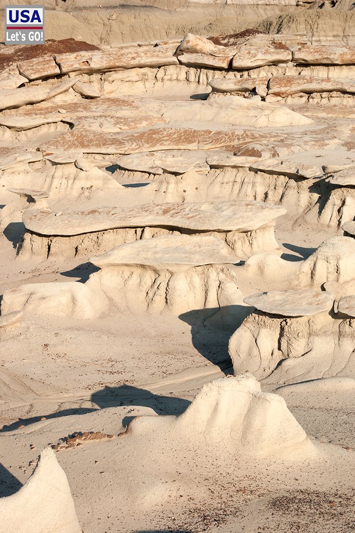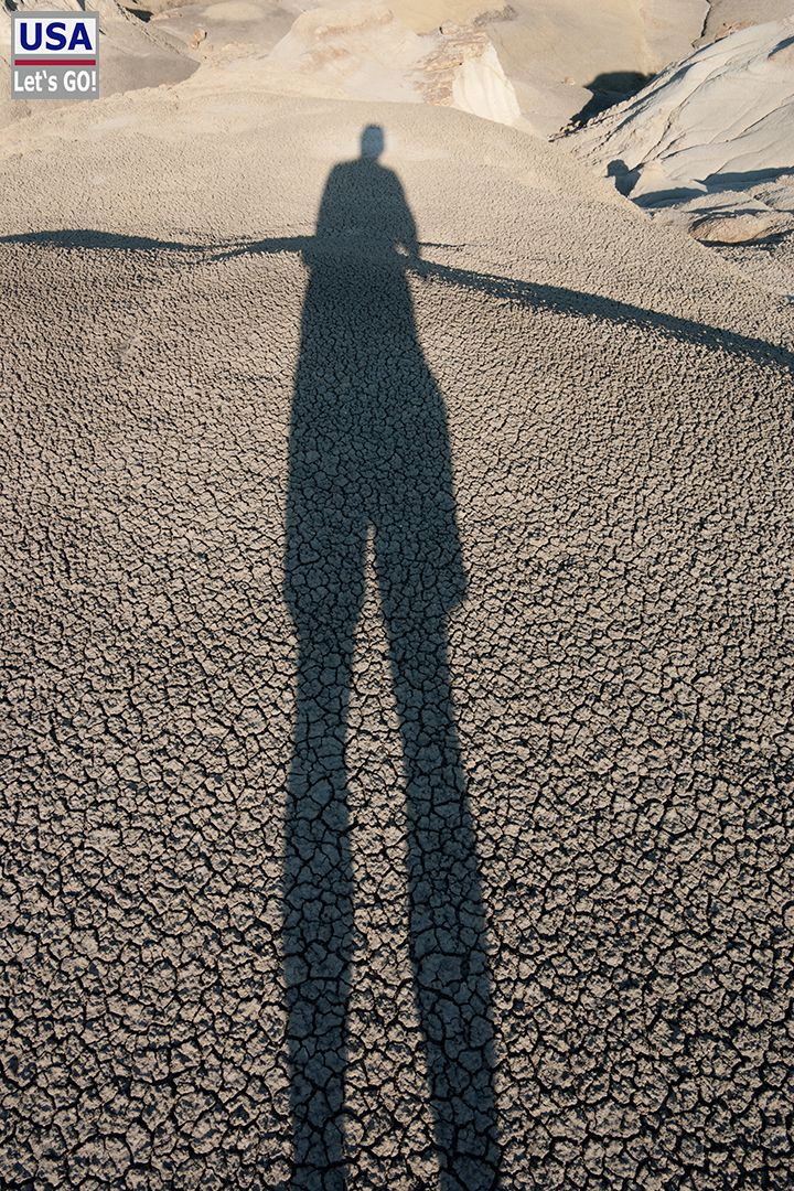 Unser Ziel war die Bisti Wilderness Area östlich von Highway 371. Gegen 17.00 erreichten wir die Abzweigung auf eine auch mit unserem Wohnmobil problemlos befahrbare gravel road, der wir bis zum kleinen Parkplatz folgten. Dort wechselte ich in meine Wanderschuhe und packte Trinkflaschen sowie mein eTrex GPS-Gerät, in das ich schon zuhause einige Koordinaten gespeichert hatte.